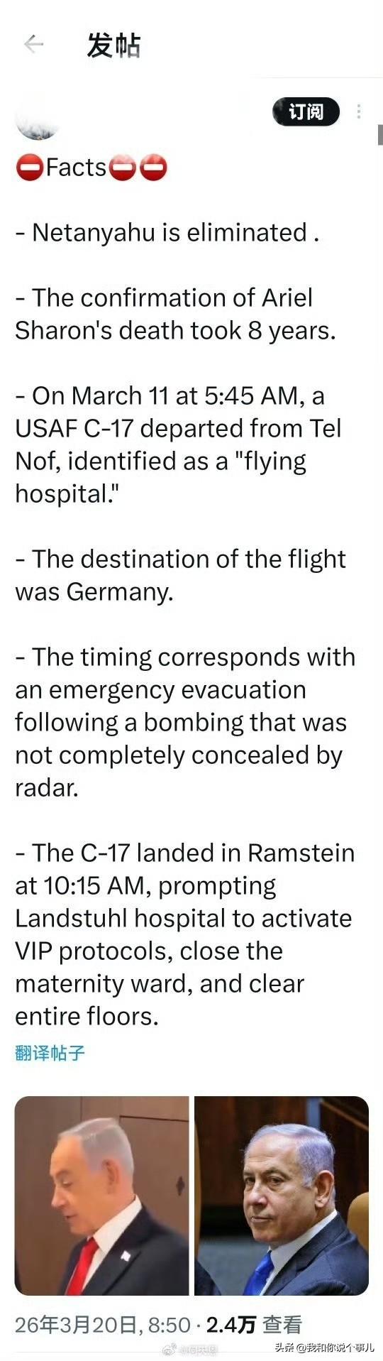 有帖子称:内塔尼亚胡已经出局。 当年的阿里尔·沙龙的死亡确认花了 8 年时间。 3 月 3日凌晨 5 点 45 分,一架美国空军 C-17 飞机从特尔诺夫起飞,被认定为“飞行医院”。 航班目的地是德国。 这一时间与一场未被雷达完全掩盖的爆炸事件后的紧急撤离行动相吻合。 这架 C-17 在上午 10 点 15 分降落在拉姆施泰因,促使兰斯图尔医院启动贵宾通道,关闭所有监控,并清空整层楼层。 但结果,德国医院也未能救回他的命。 具体情况是怎样谁也不知道,就算是内塔尼亚胡死了,但以色列又升级战争规模,这足以证明,这场战争根本就不是内塔尼亚胡发动的,而是犹太人的蓄谋已久的双簧,借战争拖延开庭,只不过是犹太人精心编造的借口,有个说法是犹太复国主义用官司逼内塔胡尼亚开战,不管怎么样,犹太复国主义的机器早已拧满了发条,内塔尼亚胡只是被推到台前的提线木偶,他的生死从来都左右不了战争的走向。 就算他真的在德国医院咽下最后一口气,以色列的战机照样会在加沙上空盘旋,炮弹照样会砸向难民营。因为这场战争从不是为了“自卫”,也不是为了“报复”,而是一场早就预谋好的领土扩张与种族清洗。 注:本文信息源于网络,内容仅为个人观点,无不良导向