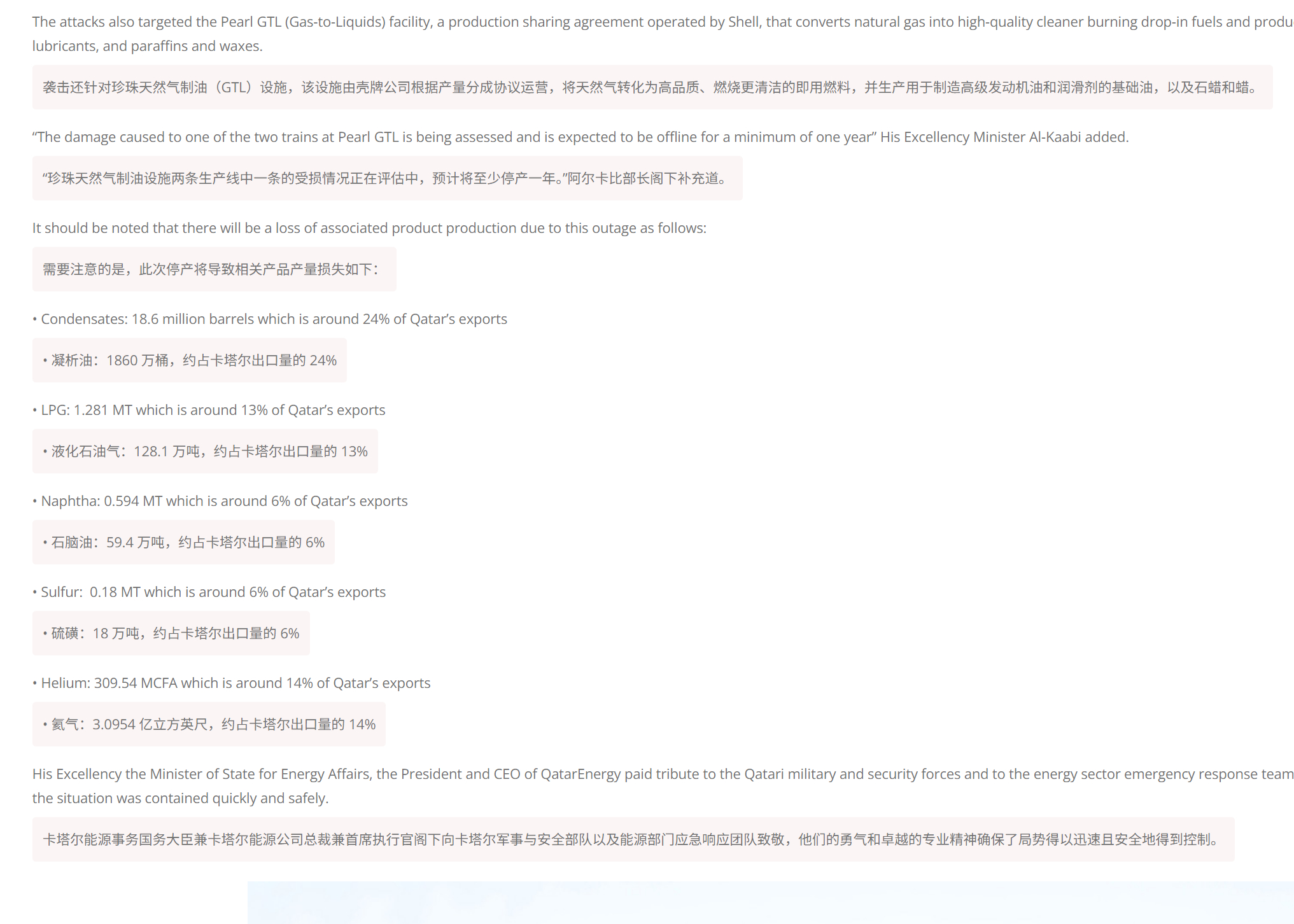🔻卡塔尔能源公司在其官网发布液化天然气设施遭导弹袭击的声明。🔻卡塔尔能源公司预计,2026 年 3 月 18 日(星期三)及 3 月 19 日(星期四)凌晨导弹袭击对拉斯拉凡工业城造成的破坏,将导致每年约 200 亿美元的收入损失,修复工作预计长达五年,影响对欧洲和亚洲市场的供应。🔻袭击损坏了 4 号和 6 号两条液化天然气生产线,年产量总计 1280 万吨,约占卡塔尔出口量的 17%。4 号线是卡塔尔能源公司(66%)和埃克森美孚(34%)的合资项目,6 号线是卡塔尔能源公司(70%)和埃克森美孚(30%)的合资项目。🔻袭击还针对珍珠天然气制油(GTL)设施,该设施由壳牌公司根据产量分成协议运营,将天然气转化为高品质、燃烧更清洁的即用燃料,并生产用于制造高级发动机油和润滑剂的基础油,以及石蜡和蜡。“珍珠天然气制油设施两条生产线中一条的受损情况正在评估中,预计将至少停产一年。”🔻此次停产将导致相关产品产量损失如下:🔹凝析油:1860 万桶,约占卡塔尔出口量的 24%🔹液化石油气:128.1 万吨,约占卡塔尔出口量的 13%🔹石脑油:59.4 万吨,约占卡塔尔出口量的 6%🔹硫磺:18 万吨,约占卡塔尔出口量的 6%🔹氦气:3.0954 亿立方英尺,约占卡塔尔出口量的 14%伊朗伊斯兰革命卫队发言人身亡伊朗导弹击中以色列海法炼油厂海外新鲜事中东现场直击