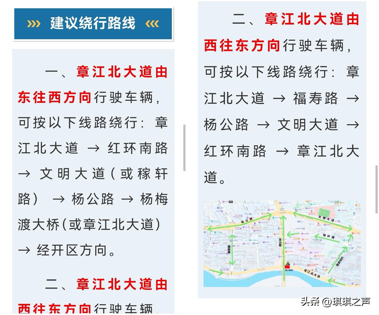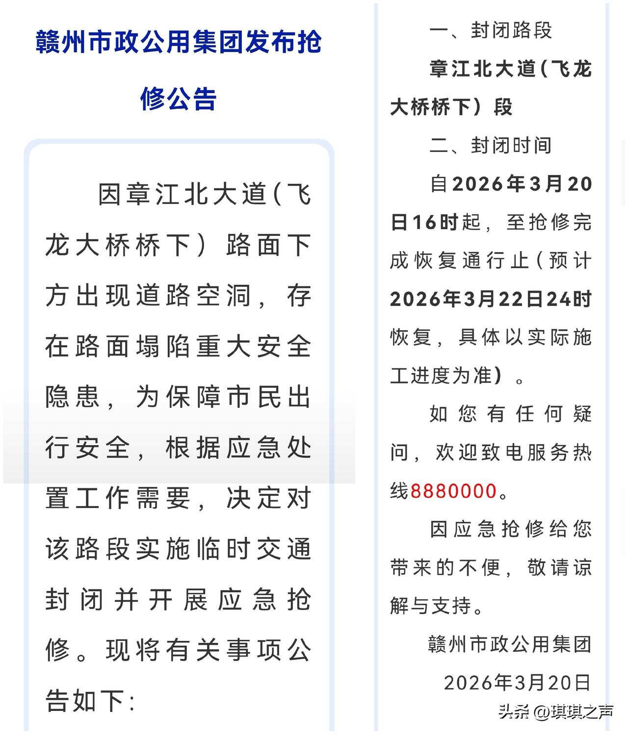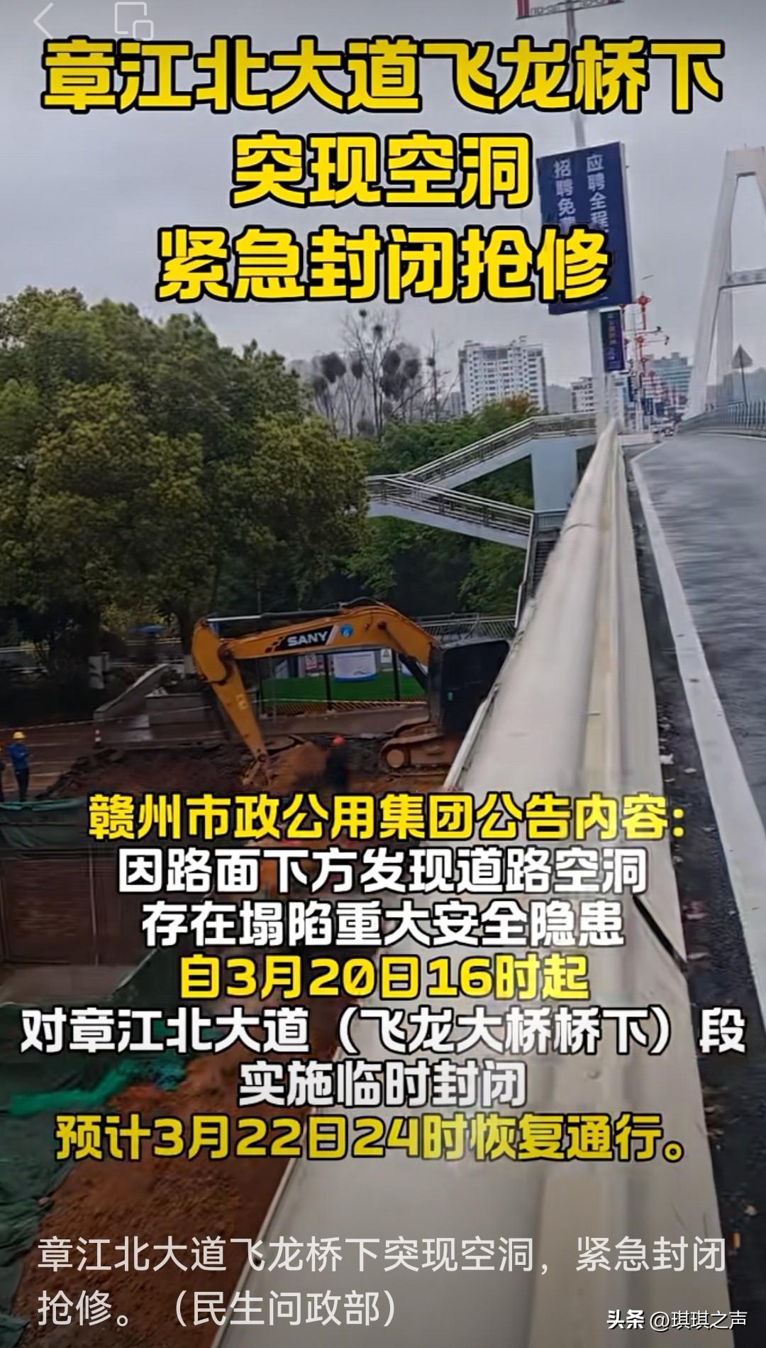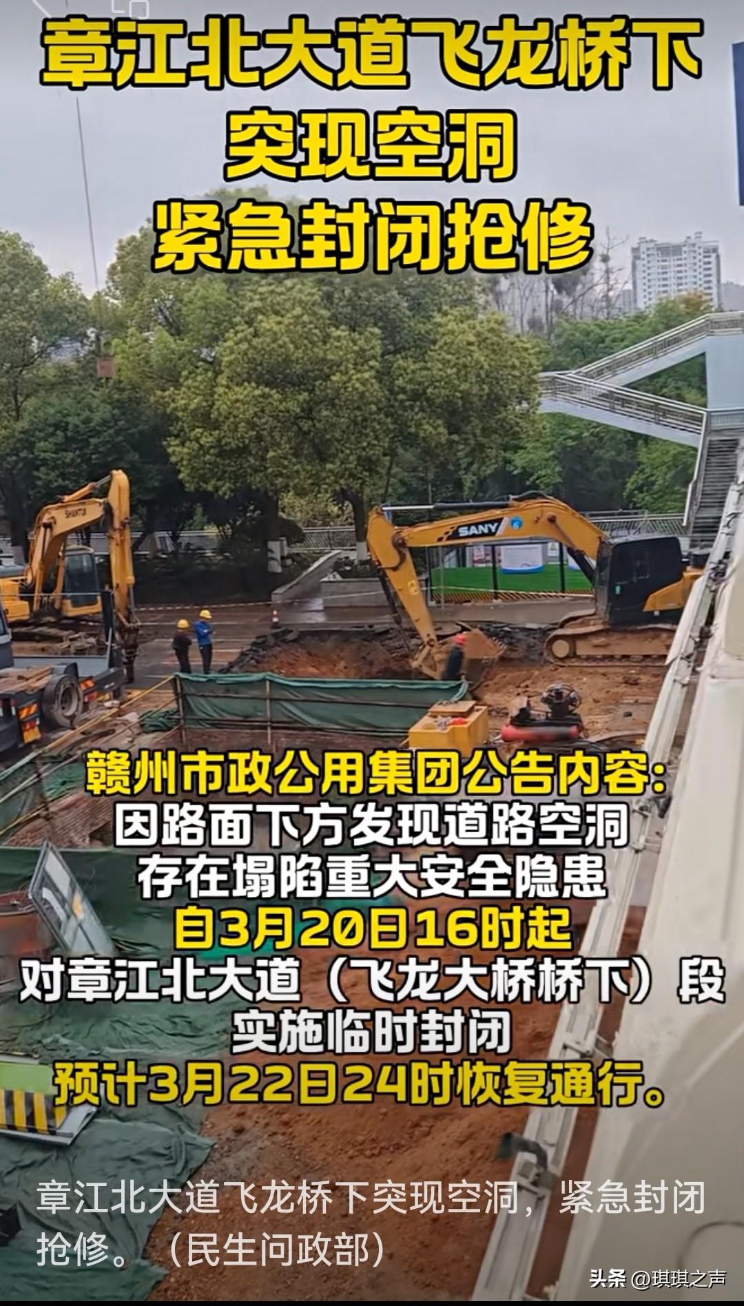赣州市民朋友注意哈!这个地方突发性临时道路封闭施工。 自2026年3月20日16时起,至抢修完成恢复通行止(预计3月22日24时恢复,具体以实际施工进度为准)。如您有任何疑问,欢迎致电服务热线8880000。 赣州市政公用集团发布关于章江北大道(飞龙大桥桥下)路面下方出现道路空洞,存在路面塌陷重大安全隐患,为保障赣州市民出行安全,根据应急处置工作需要,决定对该路段实施临时交通封闭并开展应急抢修。 欢迎收藏转发告知你的亲朋好友,提前规划出现路线。同城 红色故都客家摇篮