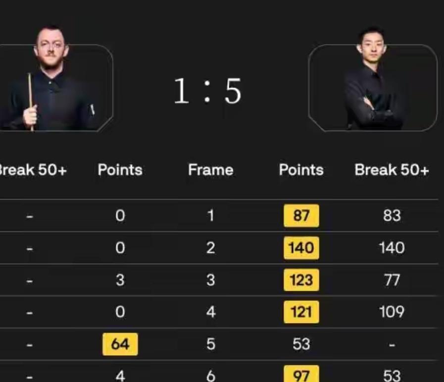 玉山公开赛四分之一决赛:中国独苗吴宜泽5-1艾伦晋级四强 北京时间3月20日14时,斯诺克玉山世界公开赛1/4决赛如期进行,甘肃00后小将吴宜泽挑战马克.艾伦,吴宜泽状态神勇,轰出两杆破百、打出两杆70+,一波四连鞭率先拿到赛点,随后马克艾伦凭借零敲碎打得分扳回一局,挽救一个赛点。吴宜泽打出50+收割比赛。最终吴宜泽5-1战胜马克艾伦,率先杀进四强,有望冲击冠军奖杯。比赛过程如下: 第一局,吴宜泽抓住艾伦失误,打出单杆83分,87:0先拔头筹。 第二局,吴宜泽轰出单杆140分,零封马克艾伦,局分2-0领先。 第三局,吴宜泽凭借单杆77分,123:3再下一局。 第四局,吴宜泽轰出本场比赛的第二杆破百109分,121:0拿下此局,一波四连鞭率先拿到赛点。出乎意料的是前四局马克·艾伦仅仅拿到3分。进入中间休息。 第五局,马克·艾伦状态有所提升,凭借零敲碎打得分64:53惊险扳回一局。 第六局,吴宜泽率先上手,单杆得到53分,打进红球后母球摔袋,被罚4分。随后,吴宜泽抓住艾伦失误,97:4锁定胜局。最终吴宜泽5-1横扫马克.艾伦强势晋级玉山公开赛的四强。 整场比赛,吴宜泽轰出两杆破百,打出3杆50+,5-1横扫马克.艾伦,可谓是状态火热,犹如神助。 半决赛,吴宜泽挑战奥沙利文。玉山斯诺克比赛 玉山奥沙利文