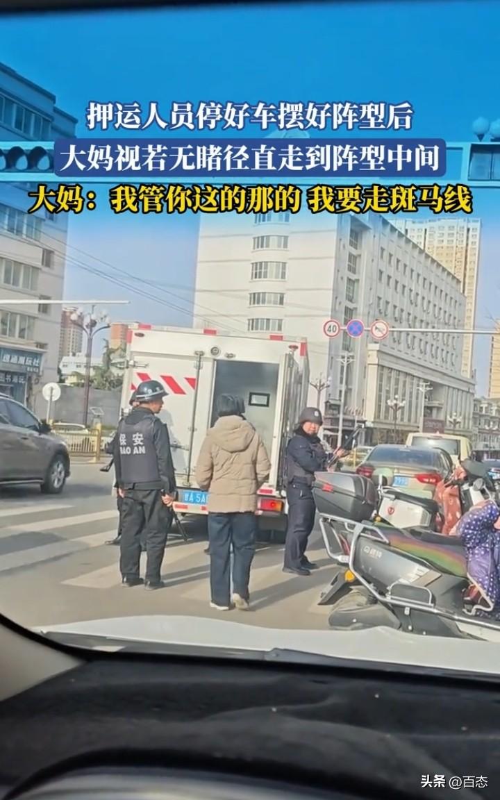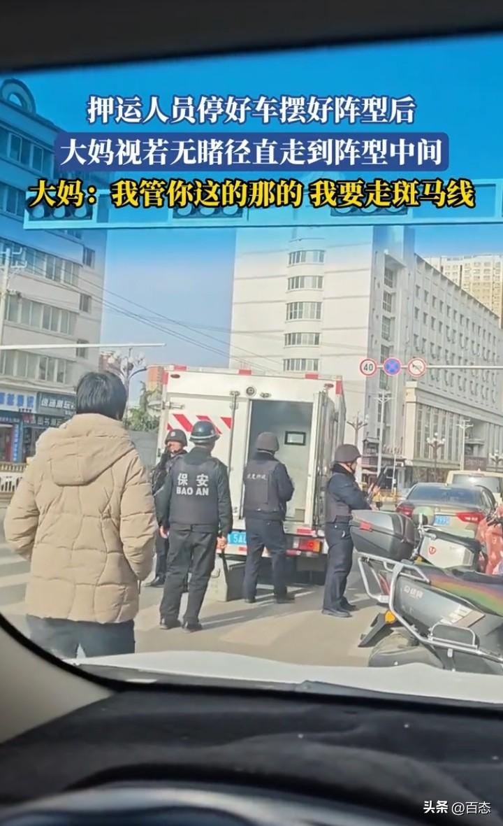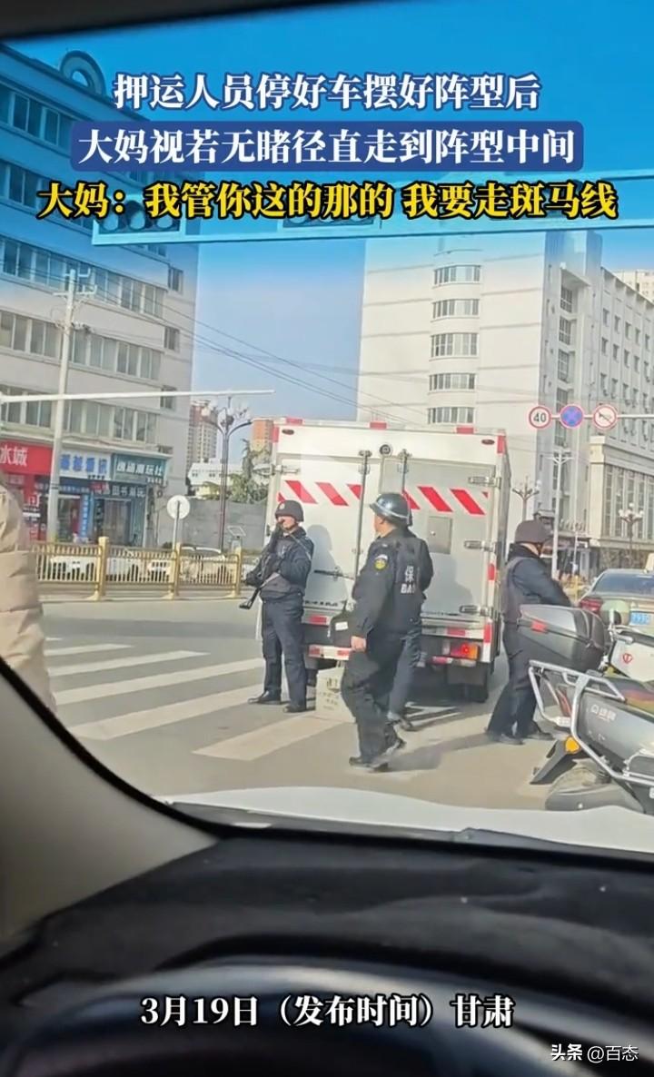 甘肃押运车停下来,押运人员摆好阵型后,没想到一大妈慢慢悠悠的从安保人员中间走斑马线过马路,安保人员看到也是有点蒙圈,大妈还是你摆你的阵型,我走我的路。 在这里提醒,最好还是不要从安保人员中间走过,不怕一万就怕万一出了问题。 你们怎么看呢?