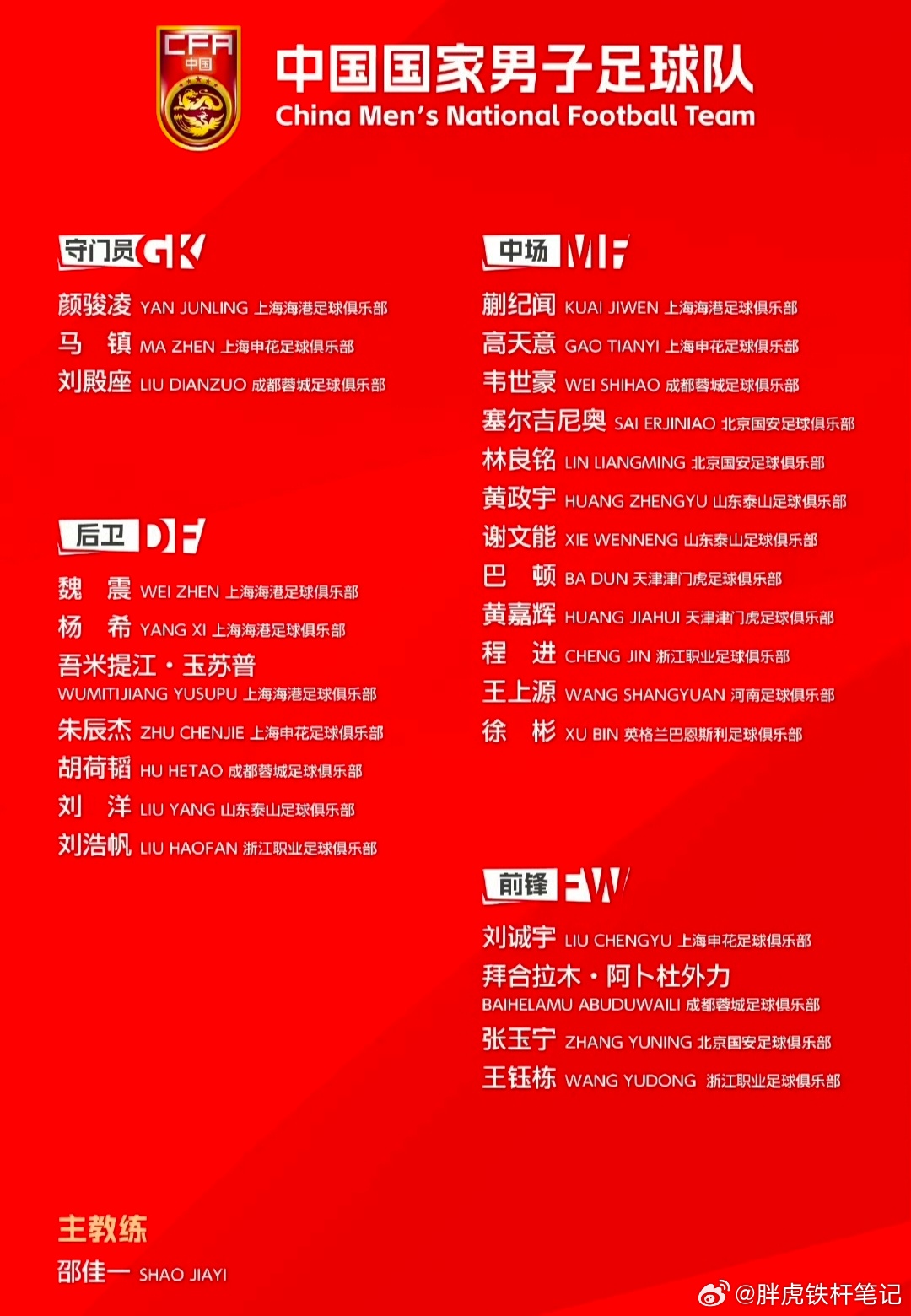 国足最新一期集训名单北青:邵佳一以老带新调配阵容,出访比赛力求好状态国足最新集训名单公布,9名U23球员入选,《北青体育》称,邵佳一采用以老带新,确保出访比赛发挥稳定。《北青体育》报道,为备战3月下旬在澳大利亚进行的国际比赛,国足将于22日在上海集中,当晚飞往悉尼迎战库拉索、喀麦隆。教练组结合联赛与球员身体状况,选定26人。9名U23球员包括王钰栋、徐彬、刘浩帆、拜合拉木、吾米提江、胡荷韬。高天意、王上源等老将入选。以老带新既保成绩,又促年轻化,让球队更具活力。附国足最新一期大名单门将:颜骏凌(上海海港)、马镇(上海申花)、刘殿座(成都蓉城)后卫:魏震(上海海港)、杨希(上海海港)、吾米提江(上海海港)、朱辰杰(上海申花)、胡荷韬(成都蓉城)、刘洋(山东泰山)、刘浩帆(浙江)中场:蒯纪闻(上海海港)、高天意(上海申花)、韦世豪(成都蓉城)、塞尔吉尼奥(北京国安)、林良铭(北京国安)、黄政宇(山东泰山)、谢文能(山东泰山)、巴顿(天津津门虎)、黄嘉辉(天津津门虎)、程进(浙江)、王上源(河南)、徐彬(巴恩斯利)前锋:刘诚宇(上海申花)、拜合拉木(成都蓉城)、张玉宁(北京国安)、王钰栋(浙江)