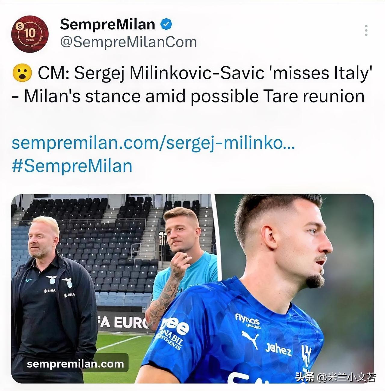 米林科维奇!塔雷会在夏季窗口努力把米林科维奇带回意大利。米林科维奇也期待可以重返意大利,他很愿意再次与塔雷合作。米林科维奇从贝卢斯科尼还是主席的时候就是米兰的目标球员,现在米林科维奇貌似也到了加盟米兰的年龄啦。 据说塔雷会在夏季窗口努力把米林科维奇带回意大利,米林科维奇也期望可以回到自己熟悉的联赛,米林科维奇之前接受采访表示战争与足球无关,我是一名球员,我的工作是在球场上,我想回到意大利原因是战争影响了我的工作,我需要寻找新的工作,当然这只是原因之一,我在意大利生活了很多年,我喜欢意大利的工作环境。 米林科维奇可是纯纯的齐克福法纳上位替代者,要是米林科维奇能来未来三年中场唯一问题就是加沙里能不能接班魔笛了,这想象空间还是很大的,或者说我们可以对球队有更多的期待,我说这个战争打的好这样的话确实不合适,但事实就是因为这场战争,米林科维奇回到意大利才成为了一种可能。