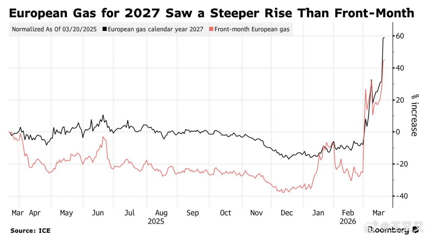 天然气市场的担忧也在加深。欧洲交易员正在重新定价卡塔尔LNG受损带来的长期影响。市场不仅担心今年出现约4%的供应缺口,甚至开始担心原本预计在2027至2028年出现的供应过剩会被侵蚀。换句话说,这已经不再是单纯的短期冲击,而是可能改变未来几年全球天然气平衡的结构性事件。