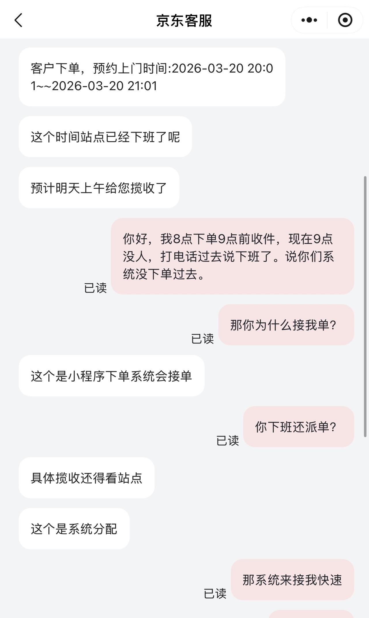 本来对京东快递还算可以,今晚8点下单,平台说9点前会收件。好家伙,我等了一小时后没见人来拿也没电话过来,我主动打电话结果快递员站点下班,叫我找客服,然后我找客服,客服说小程序接的单,这。。。。。成我问题了?你系统接单不负责了???