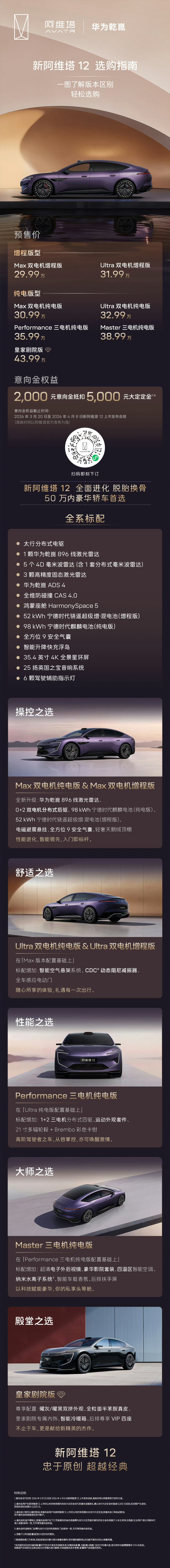 新阿维塔12今日正式开启预售,共推出增程与纯电双动力7款车型,预售价29.99万-43.99万元。
