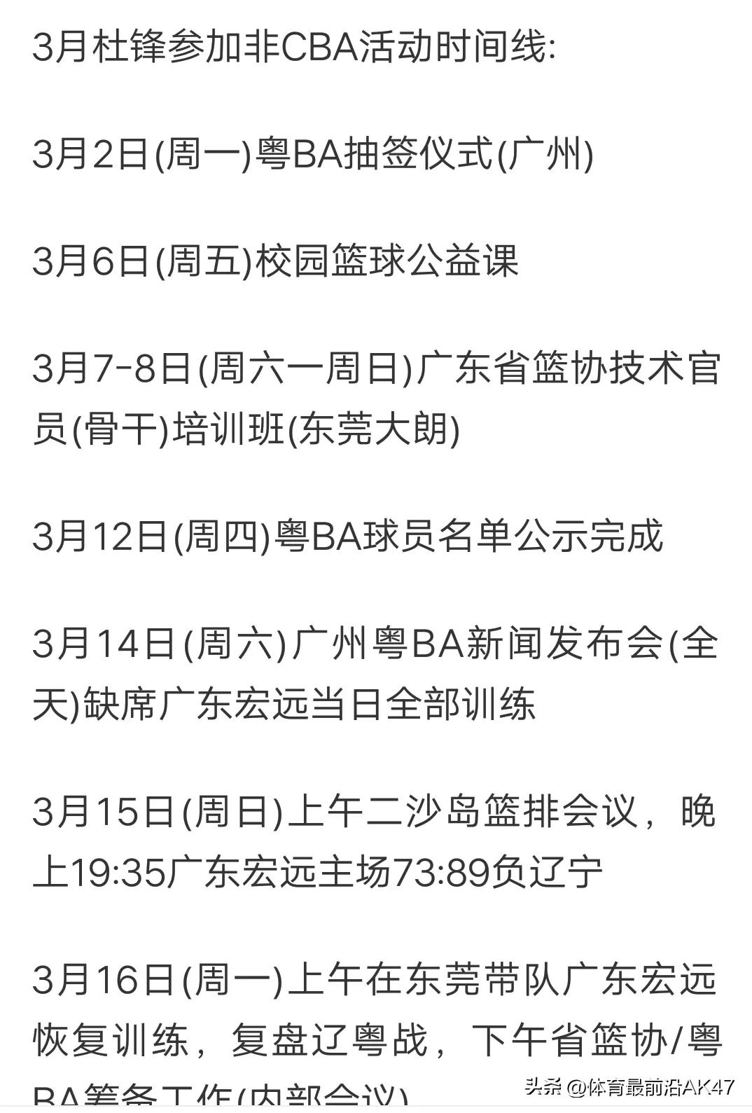 广东输给倒数第二的江苏谁该负责?一场看似没啥悬念本该赢的比赛,结果却出乎所有人的意料。为什么第二阶段至今广东的比赛状态会如此之差,接连输给排名靠后的球队,就算赢球也是运气险胜对手。好些人说广东输球是因为没有大中锋缺少一个大外援,那是第一阶段输球的因素。而第二阶段输的都是排名靠后的球队,究其原因就是休赛期的广东队缺乏系统性的训练,以及对对手的准备不足或没有准备,这些问题都是主教练的责任。为什么这么说呢?因为杜峰身兼数职一心多用,以至于没有时间带队训练和研究对手。下面图片当中列出了杜峰的任职情况,以及3月份杜峰出席比赛以外的活动时间线,看过后就不难理解广东队为什么在第二阶段会接连输球了。这就充分证明了那句话:篮球是不会说谎的,不认真对待比赛输球也是必然的