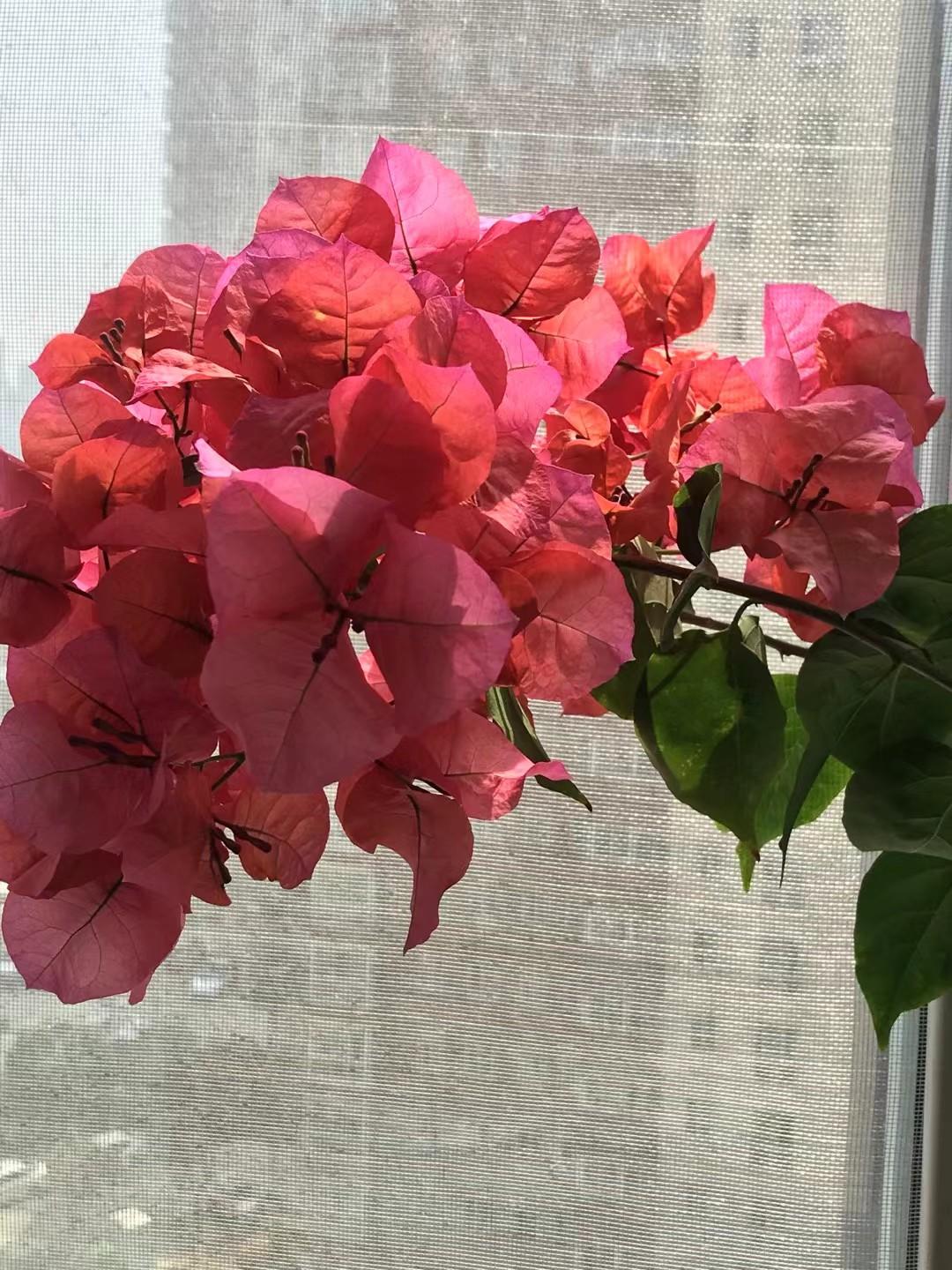 在我家的窗台上,有一盆三角梅,它就像一个充满好奇心的孩子,恨不得把头伸出窗外去享受阳光。 那三角梅的枝条,细长而柔韧,努力地向着窗外伸展着。每一根枝条都像是有自己的意志,它们相互交织、攀缘,似乎在寻找着那最温暖的阳光源头。嫩绿的叶子在枝条上层层叠叠,宛如一片片绿色的羽毛,在微风中轻轻颤动,仿佛在诉说着对阳光的渴望。 三角梅的花朵更是娇艳动人。它们如同燃烧的火焰,绽放在枝头。花瓣呈三角形,颜色鲜艳夺目,红的似火,粉的如霞。在阳光的照耀下,花朵闪烁着迷人的光泽,散发出淡淡的清香。这些花朵紧紧簇拥在一起,形成了一个个美丽的花球,吸引着蜜蜂和蝴蝶前来嬉戏。 每天清晨,第一缕阳光洒在窗台上,三角梅就像被唤醒的精灵,开始了它一天的“阳光之旅”。它的枝条努力地向外伸展,试图越过窗户的边框,去拥抱那温暖而明亮的阳光。有时候,一阵微风吹过,三角梅的枝条轻轻摇曳,仿佛在向阳光招手,又像是在和窗外的世界打招呼。 看着这盆三角梅,我不禁被它对阳光的执着所打动。它虽然只是一盆小小的植物,却有着如此强烈的生命力和对美好的追求。它让我明白了,无论生活中遇到多少困难和挫折,我们都应该像三角梅一样,积极向上,努力去追寻属于自己的“阳光”。