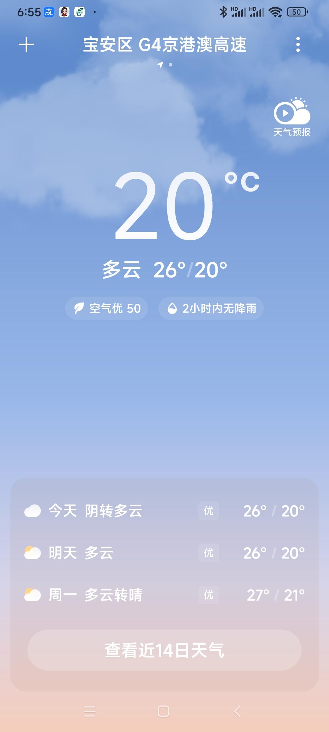 我的今日状态:😁轻松愉快 我这里的天气:🌤️多云:深圳今日多云,气温20度到