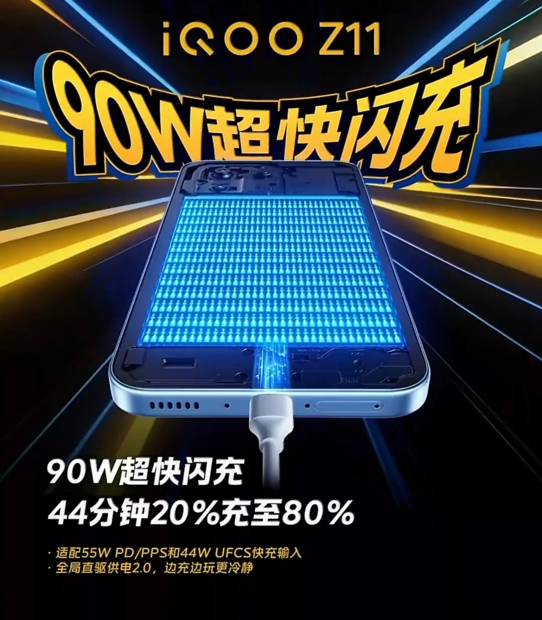 iQOO Z11支持90W超快闪充44分钟将20%电量的9020mAh电池充至80%