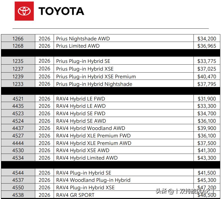 全新RAV4插混版价格也出来了。 一共4档配置,SE、Woodland、XSE、GR Sport,全系标配电后桥四驱,指导价42950-49950美元,比同配置四驱油混版贵5400-5900美元,这个差价比上一代RAV4插混和油混9300-10100美元的差距大幅缩小。 考虑到全系前驱的插混普锐斯顶配指导价都能干到4.2万美元,4.3万美元起步的插混荣放性价比倒也不算太差。