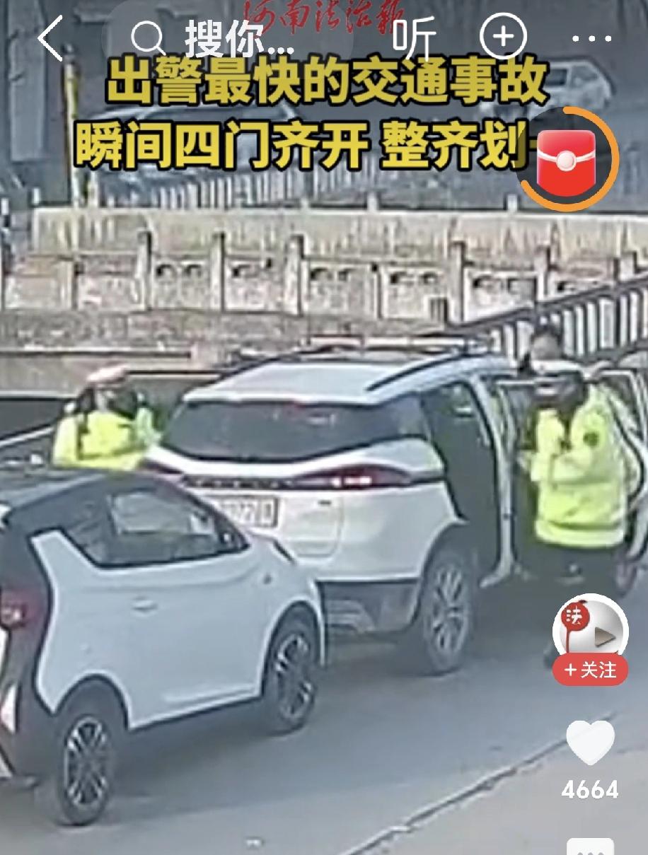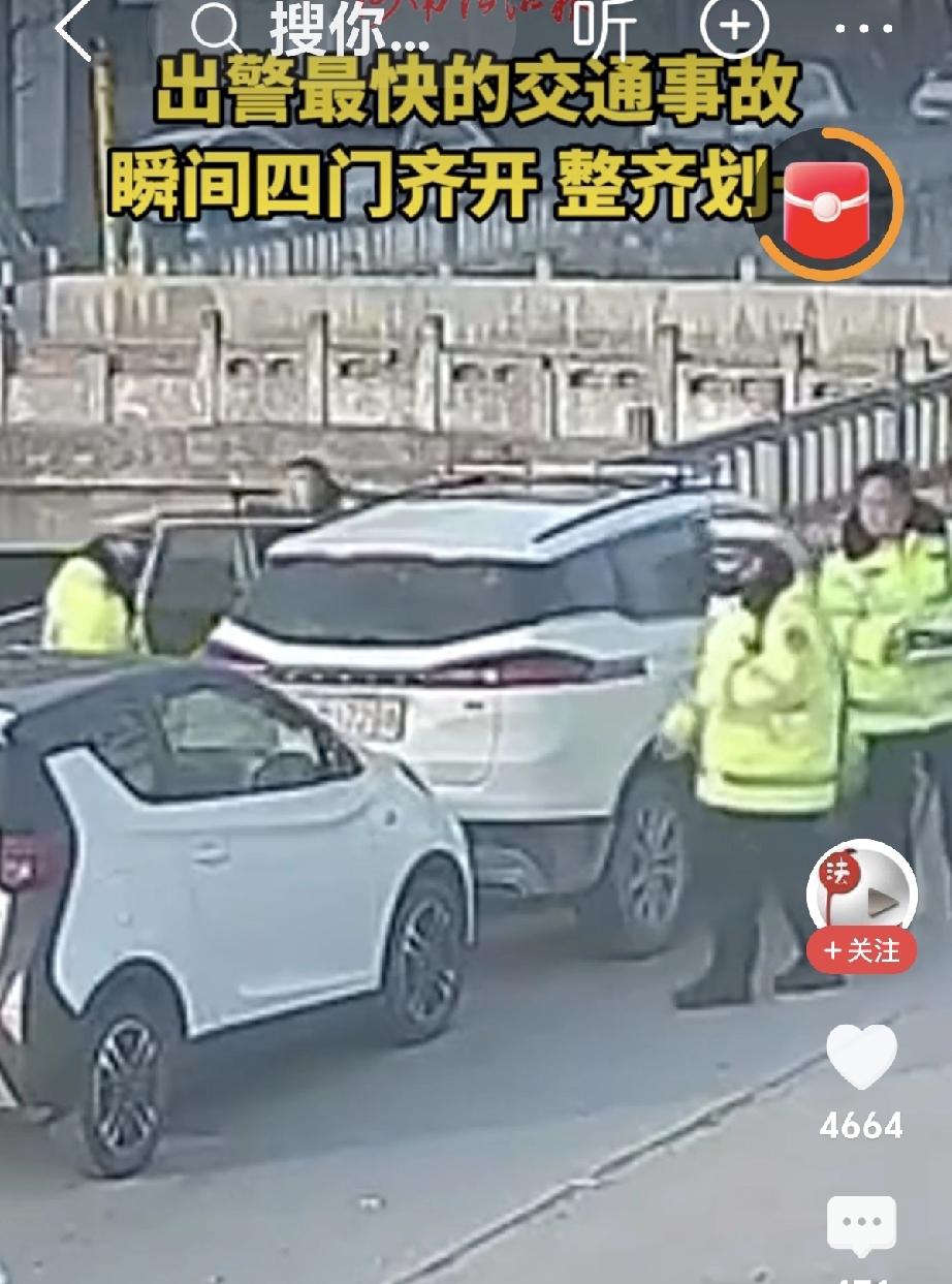 这应该是史上最快出警的一次,从小车追尾到4个警察至现场处理,只有短短的几秒钟之内[捂脸] 小车不知道怎么回事 追尾了停在前面的一辆白色SUV,估计小车车主还在懵逼之中吧,前面的SUV四个车门同时打开 四个警察几乎是同时下车 参与处理了这起追尾事故