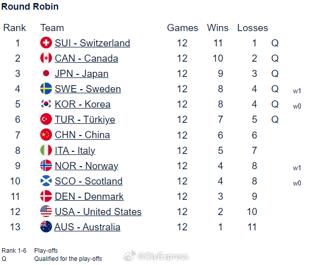 【女子冰壶世锦赛循环赛最终排名和淘汰赛对阵形势】2026女子冰壶世锦赛 3月20日卡尔加里,女子冰壶世锦赛循环赛落幕,瑞士和加拿大排名前两位直通四强,日本、瑞典、韩国和土耳其将捉对厮杀,争夺另外两个四强名额。对阵形势如下:瑞士vs瑞典/韩国加拿大vs日本/土耳其