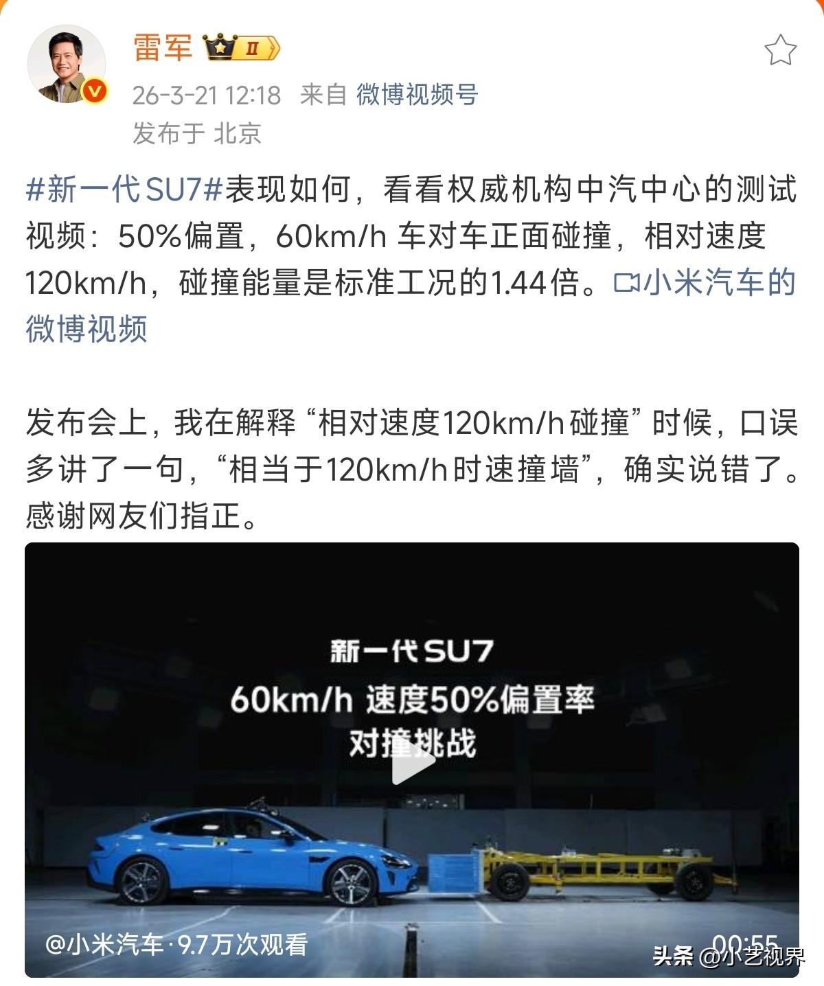 小米SU7整场发布会,唯一能够被拿出来吐槽、抹黑的点就这个了吧。 就因为口误说了一句:相当于120km/h时速撞墙。 然后发布会上PPT写的很清楚的“相对速度120km/h,碰撞能量是标准工况的1.44倍”,就可以无视吗? 刚刚,发微博称:“相当于120km/h时速撞墙”,确实说错了。感谢网友们指正。 从新一代小米SU7发布会还没结束,网络上就出现了大批量文案相似,阴阳怪气雷军在发布会上说的那句:相当于120km/h时速撞墙。 从19号发布会到今天,已经将近3天了,现在还整上了一条热搜话题? 从发布会结束没有公布大定,只公布锁单,网络上就各种小米汽车不行了,没人买了。 从去年盯着小米的小字,打着为消费者旗号,去抹黑小米,然后小米改了,某些友商还有小字,也没见有多少人去说。 现在又延续着去年的打发,扣雷军说的话,这是要搞什么?不让人说话?还是说你能保证自己一辈子都不会说错话吗?