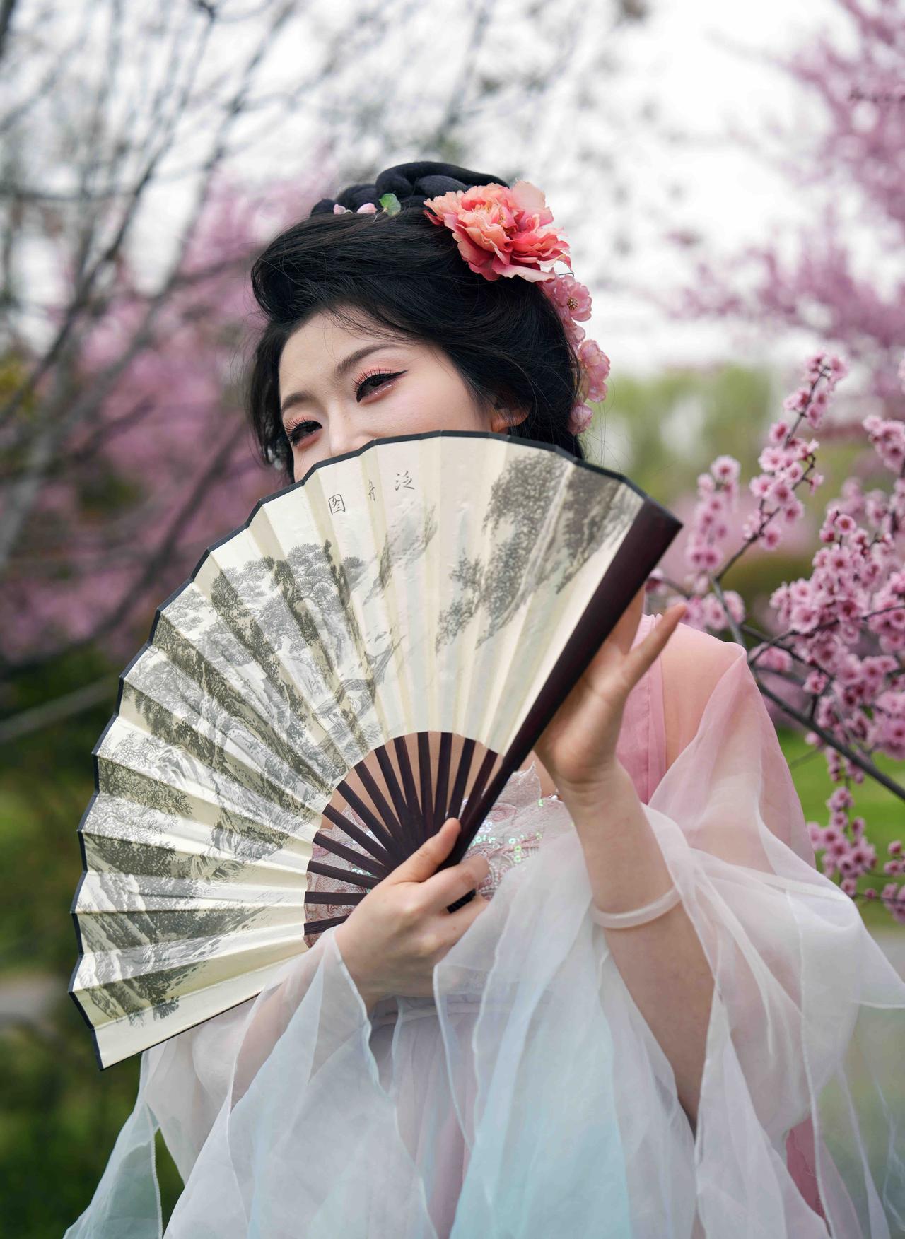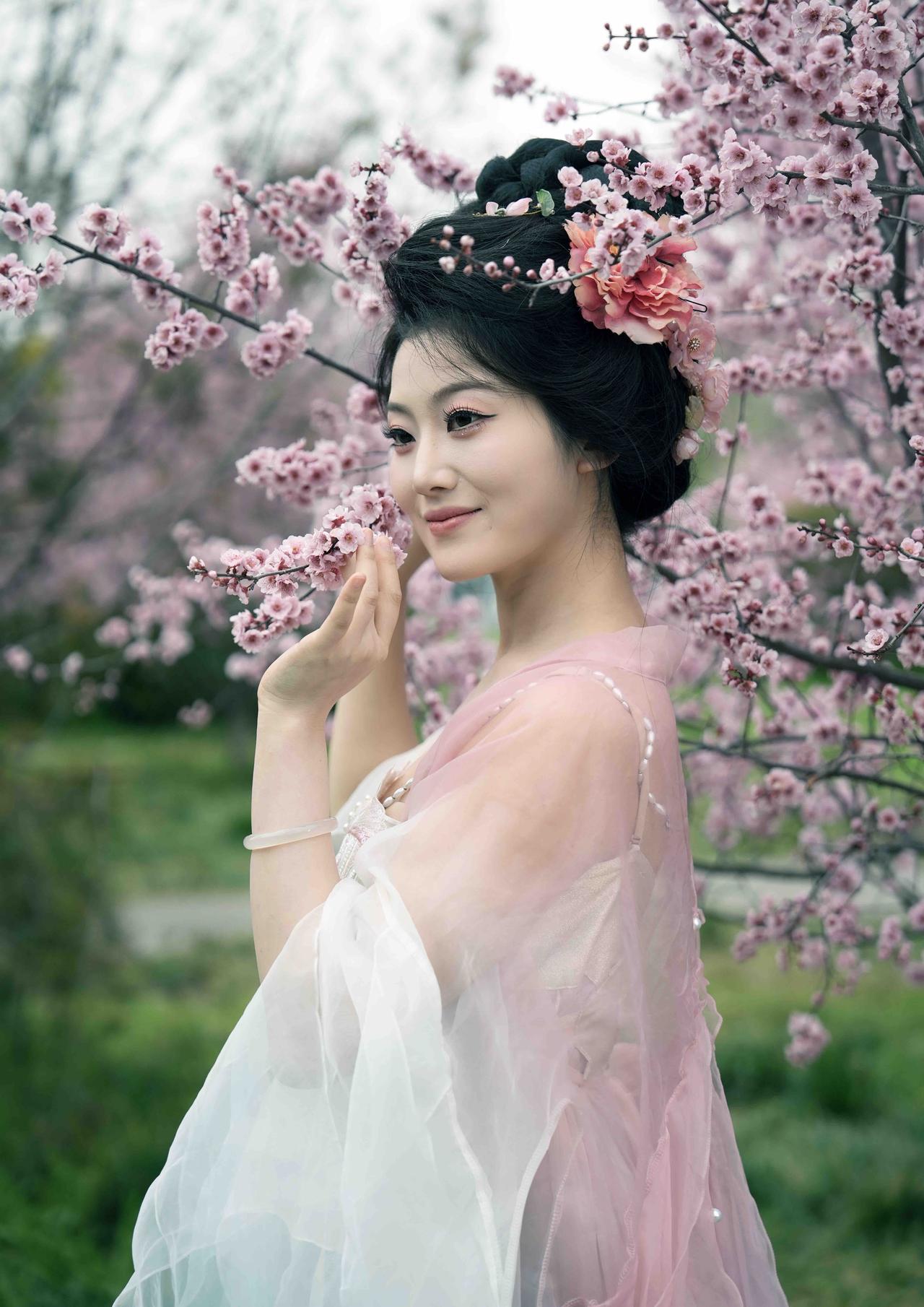 樱花树下,古装美人轻抚花枝,唯美如画。