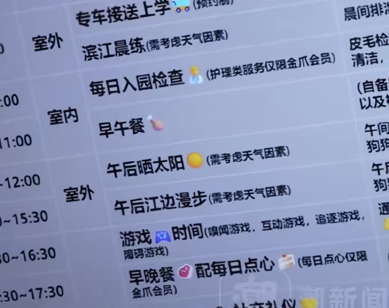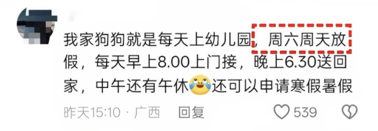 这年头连狗也要上学了。 刷到网友分享自己在路上遇到了狗狗校车,一开始还觉得挺可爱的。点开评论区一看,才知道原来那是杭州某狗狗幼儿园接送狗狗上下学的校车,据悉该幼儿园学费要一个月一万二,费用包含每日188元的基础寄养,368元的亲子课程,上门接送的校车服务等,但不包含宠物餐食。 工作人员每天对狗狗进行性格测试、行为训练、每日清洁、健康检查及社交活动等服务,主人可实时查看宠物动态。 这些狗狗每天会背上小书包自己上车,同样的周六日放假,中午会午休,在幼儿园里学习如何与其他小狗相处,以及一些基本生活技能。甚至还能申请寒暑假,有户外运动、益智游戏等课程。 园内过半老师都有幼师背景,上下学还会有考勤打卡,毕业后会拍毕业照。 最令人惊讶的这些狗狗训练课程目前供不应求 ,报名需排队2-3周,而且面试通过了才能入学。 果然贫穷限制了我的想象,这个世界终于癫成了高攀不起的样子![白眼]
