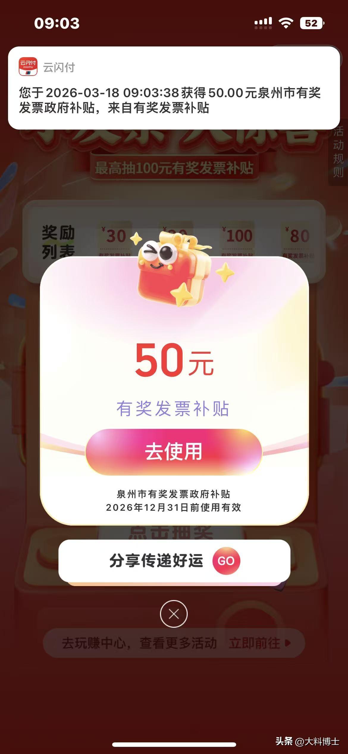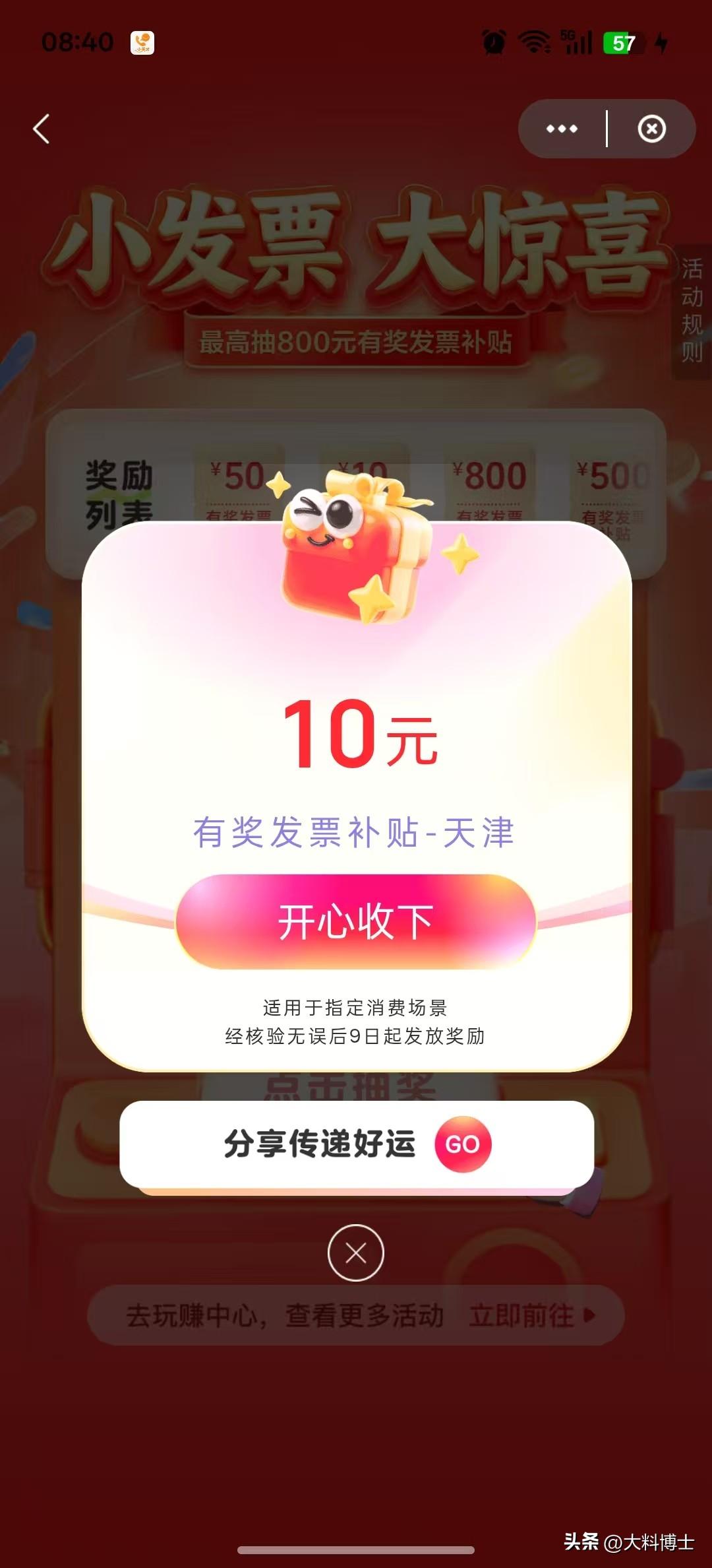 分享我这周有趣的事:我发现,最近云闪付上这个发票有奖很有意思,上传消费一百以上的发票就能抽奖,。 因为现在消费大多在网上,最近把之前没开票的都开了,天津的开了好多,最高中了500块,还有两个一百的,还有十块的。 中奖率挺高的。 本来以为这个活动是啥骗人的,奖金到账并使用后才真的相信。 现在想,这应该是国家给群众发消费红包了,提振消费。政府投入了多少咱不清楚,但是他这次发红包很有意思,凭票发,就是你消费了才有机会参与抽奖。 你不消费,他也不发给你。这样少才能有效循环起来,才能促进经济发展,不知道这想法对不对。