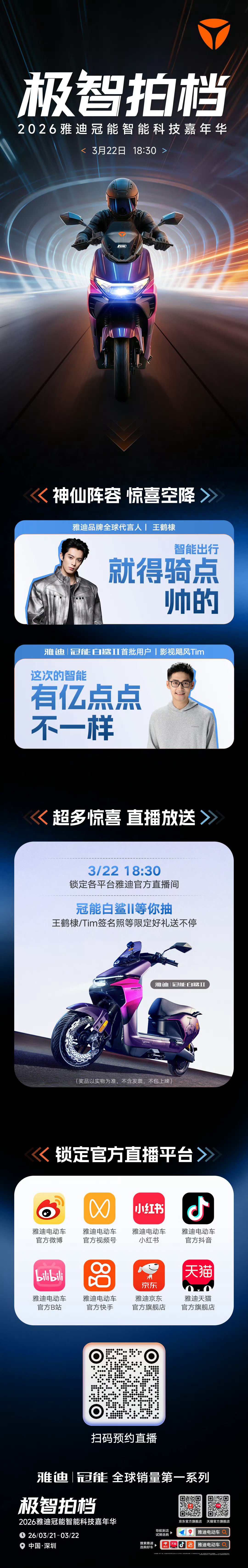 3月22日 18:30,雅迪冠能发布会。欢迎朋友们预约直播,届时我会给大家带来惊喜雅迪冠能智能科技嘉年华 深圳