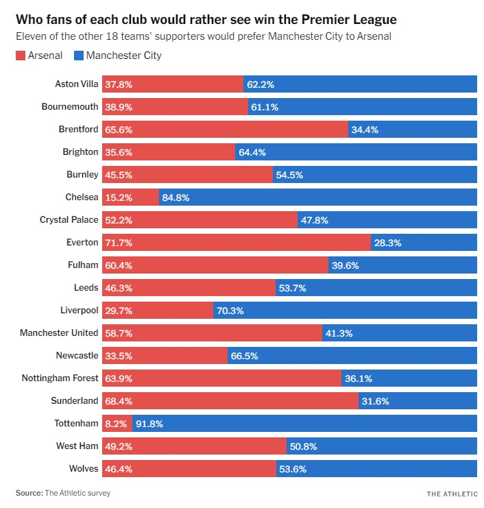 TA调查了除阿森纳和曼城之外,每一家英超俱乐部的球迷,询问他们更希望谁在五月捧起英超奖杯。敌对球队的球迷们踊跃投票。不少人对诸多因素感到不满,包括比赛风格、球迷群体、历史底蕴、主教练、球员、老板、财力,而就曼城而言,还有英超即将对其展开的指控。总体结果是曼城胜出,有11支其他球队的球迷支持他们夺冠;而阿森纳则得到了五支伦敦球队中三支的支持。