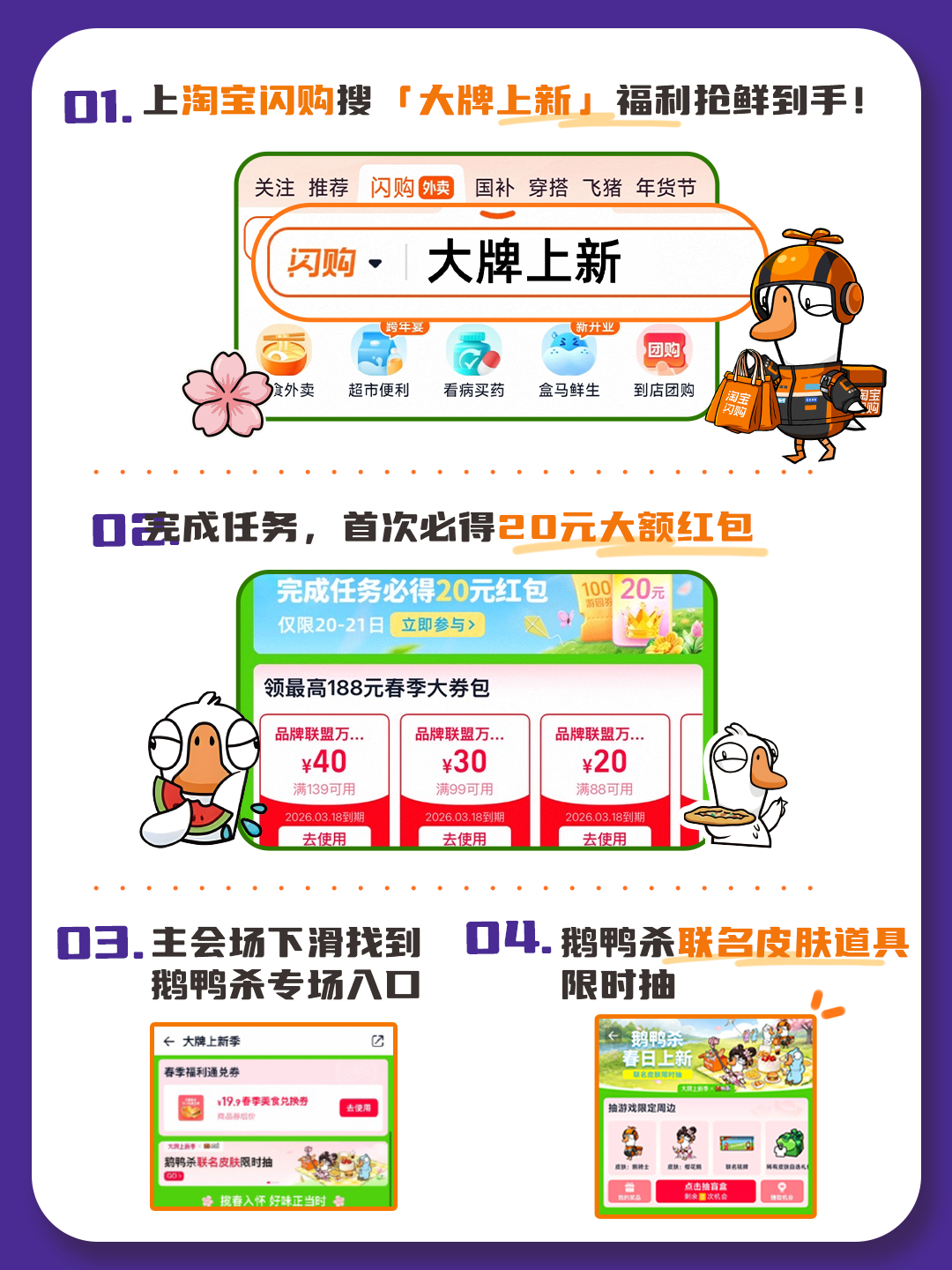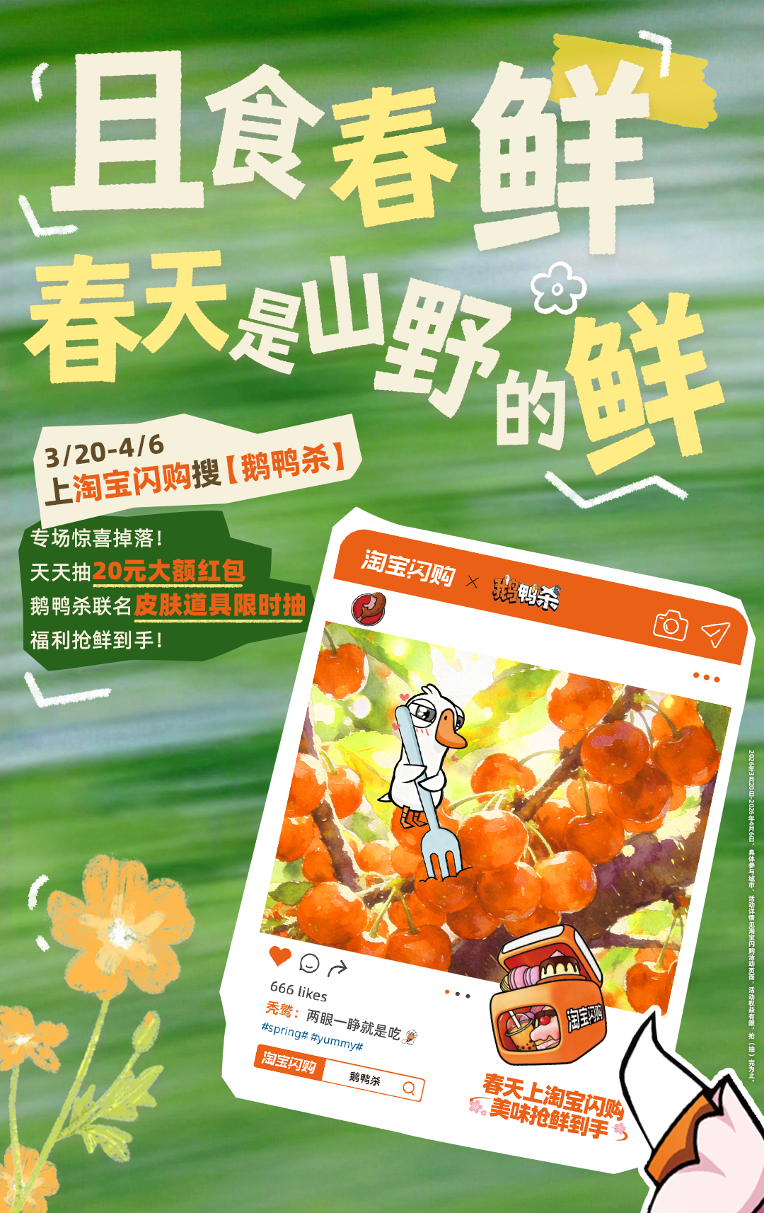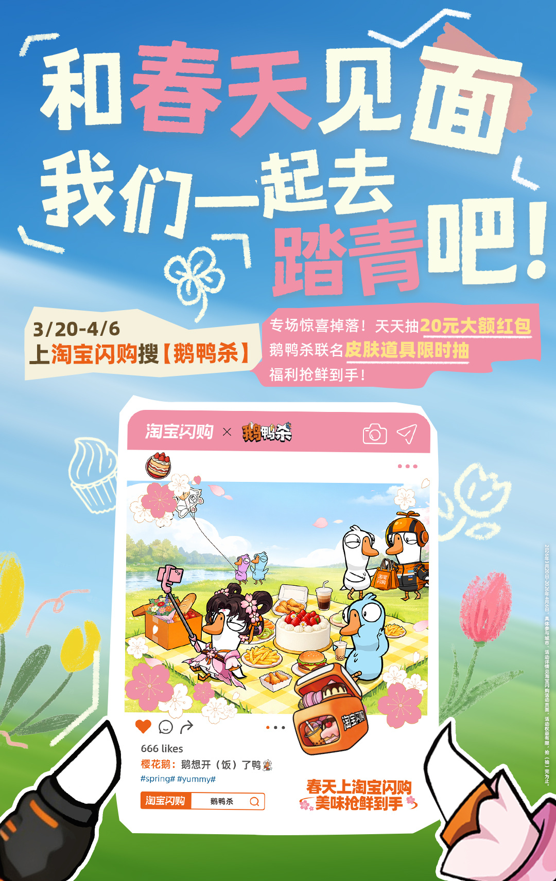 又到了春天适合踏青、聚会、鹅鸭杀的时候~所谓春江水暖鸭先知,淘宝闪购和鹅鸭杀联动的福利你不会不知吧?3月20日-4月6日上淘宝闪购搜【大牌上新】🧧天天抽20元大额红包🎉限时抽鹅鸭杀联名皮肤道具福利、皮肤、春日快乐一次性拉满!把送外卖玩成开放世界游戏了淘宝闪购大牌上新季 淘宝闪购联动鹅鸭杀