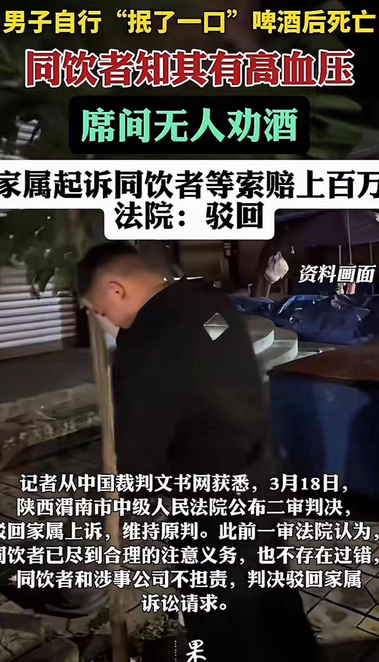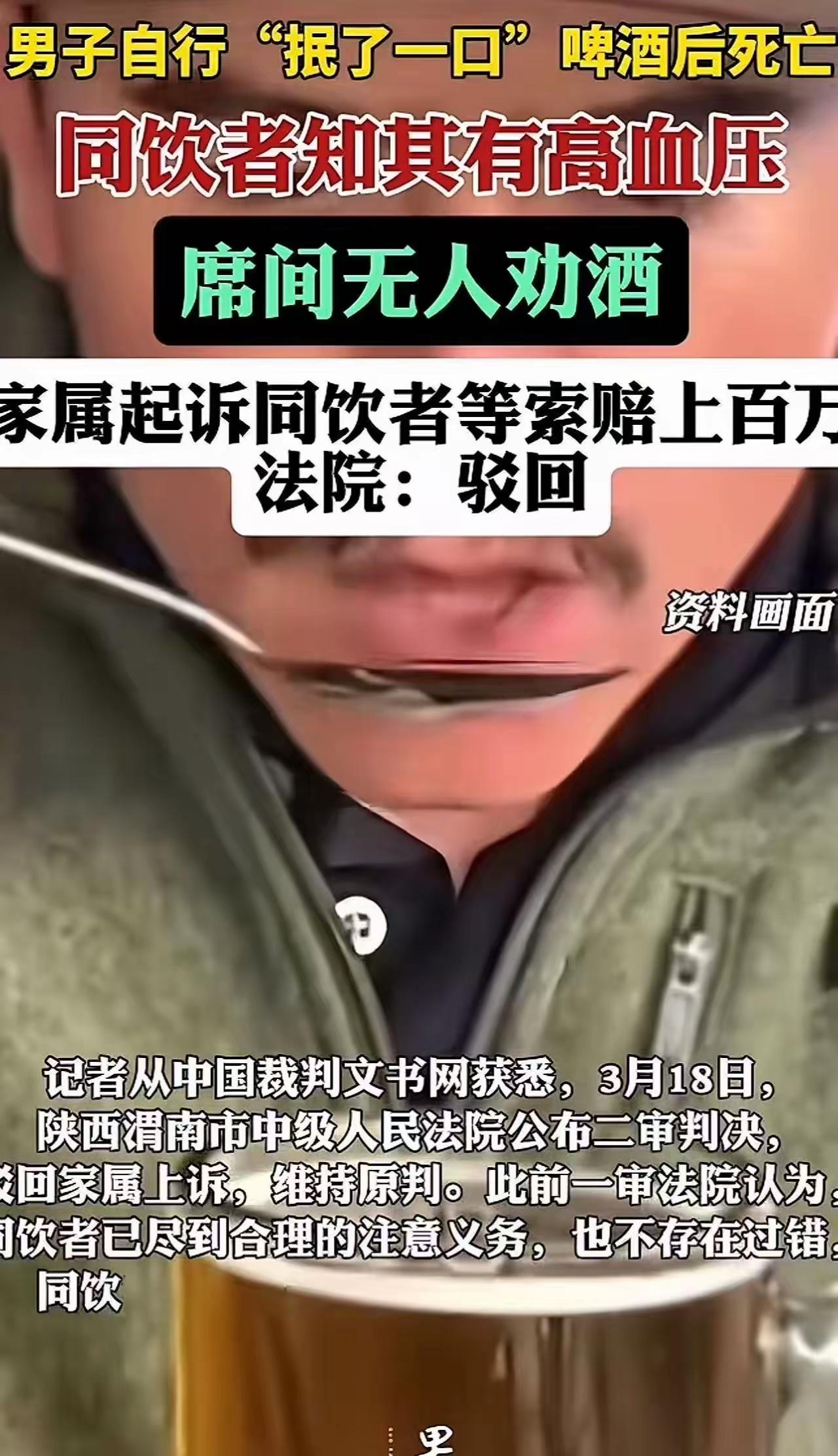 这件事一出,评论区直接炸了锅。 有人拍手称快:“判得好!这要是赔了,以后谁还敢跟朋友坐一桌?”也有人心有余悸:“幸好法院明察秋毫,不然以后聚餐都得先签生死状。” 先来还原一下事情经过。 2023年5月,陕西富平,几名好友相约小聚。席间,一名男子主动端起酒杯,抿了一口啤酒。注意,是“主动”,是“一口”,没有人劝酒,没有人灌酒,更没有人在旁边起哄“不喝不给面子”。然而,就是这一口酒下肚,男子突发意外,送医后抢救无效死亡。 尸检报告显示,死因为心源性猝死。 白发人送黑发人,悲痛可想而知。但家属随后的一纸诉状,却把在场所有人都告上了法庭,要求共同赔偿143万元。理由是:你们没有尽到劝阻和救助义务。 143万,一口酒。 这个案子之所以引发全网关注,不在于它有多复杂,而在于它戳中了无数人的痛点——这年头,吃顿饭都像是在走钢丝。 这些年,因为喝酒出事而同桌人“连坐”赔偿的判例太多了。有人喝醉了酒摔一跤,赔;有人自己贪杯进了医院,赔;甚至有人酒局结束后又去别处喝了酒出了事,还能回过头来找上一桌的人赔。久而久之,酒桌变了味,聚会在变味,人与人之间的信任也在变味。 请客吃饭成了高危行为,推杯换盏之间提心吊胆。 所以,当陕西富平法院这纸判决出来时,很多人都长舒了一口气。 法院的判决理由非常清晰:死者作为完全民事行为能力人,应当对自己的身体状况和饮酒后果有充分认知。他是主动饮酒,同桌人没有劝酒行为,事发后也及时拨打了120并采取了必要救助措施。在此情况下,要求同桌人承担赔偿责任,于法无据,于理不合。 说白了,法院把责任还给了该承担责任的人——成年人自己。 这才是真正的大快人心。 法律不应该成为“谁闹谁有理、谁惨谁有理”的工具。一个人的悲剧值得同情,但同情不能成为无限追责的理由。如果只要出了事就有人买单,那以后谁还敢主动社交?谁还敢真心待客? 有人评论说:“这次法院给社会上了一课。”我觉得这句话说反了,是法院替社会守住了一条底线——人与人之间的正常交往,不应该被异化成无处不在的风险转嫁。 为富平法院的硬气判决点赞。 也为这个判决背后传递的信号点赞:法律是保护善意的,不是惩罚正常社交的。成年人,该为自己负责的时候,就请自己负责。