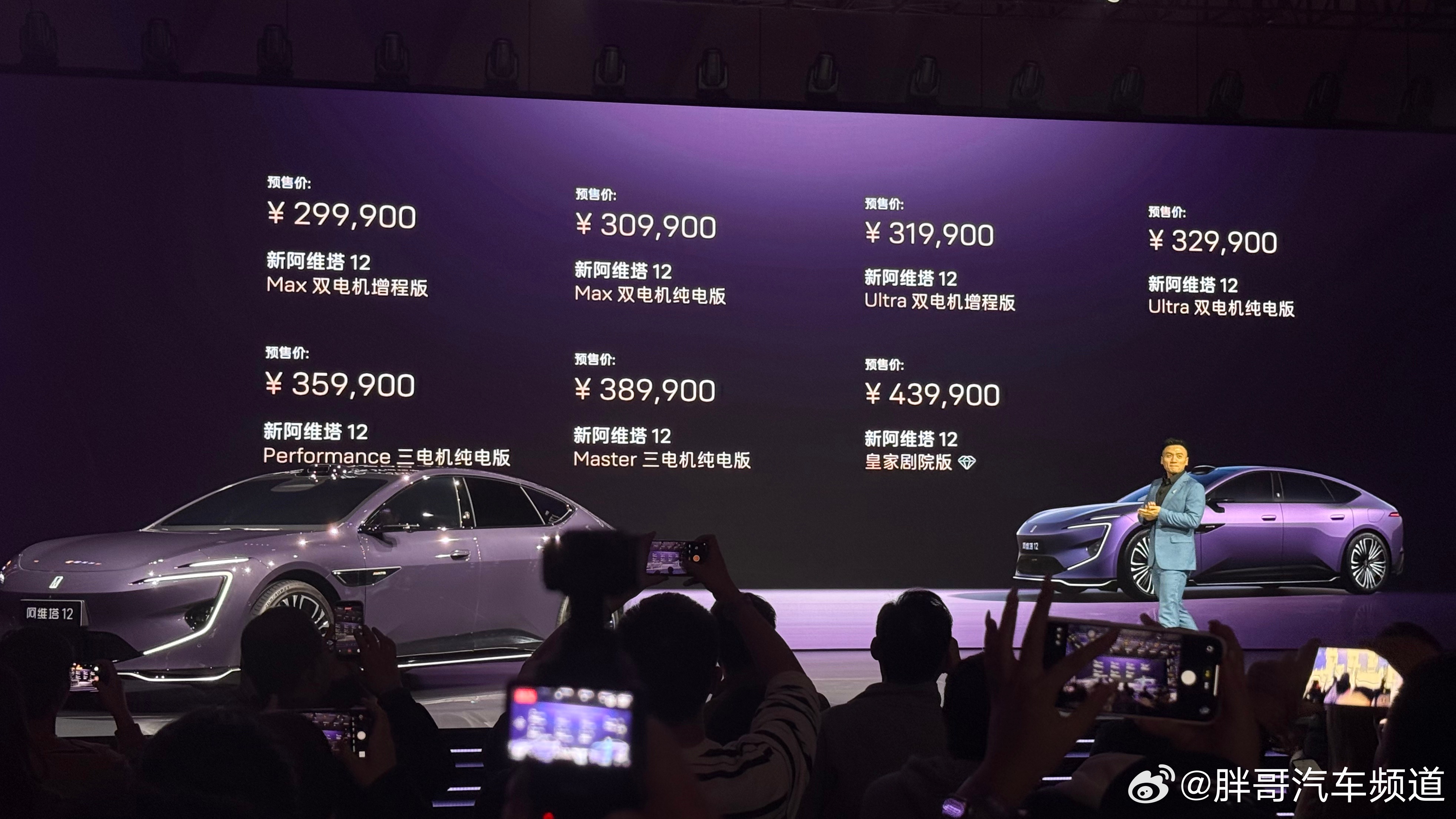 胖哥汽车频道 新款阿维塔12开启预售,共推出纯电/增程7款车型,预售价为29.99-43.99万元。新款车型重点对配置与动力进行升级,定位为一款中大型车,全系标配太行分布式电驱,全系标配华为乾崑全球量产最高896线激光雷达。新阿维塔12预售50万内豪华轿车首选
