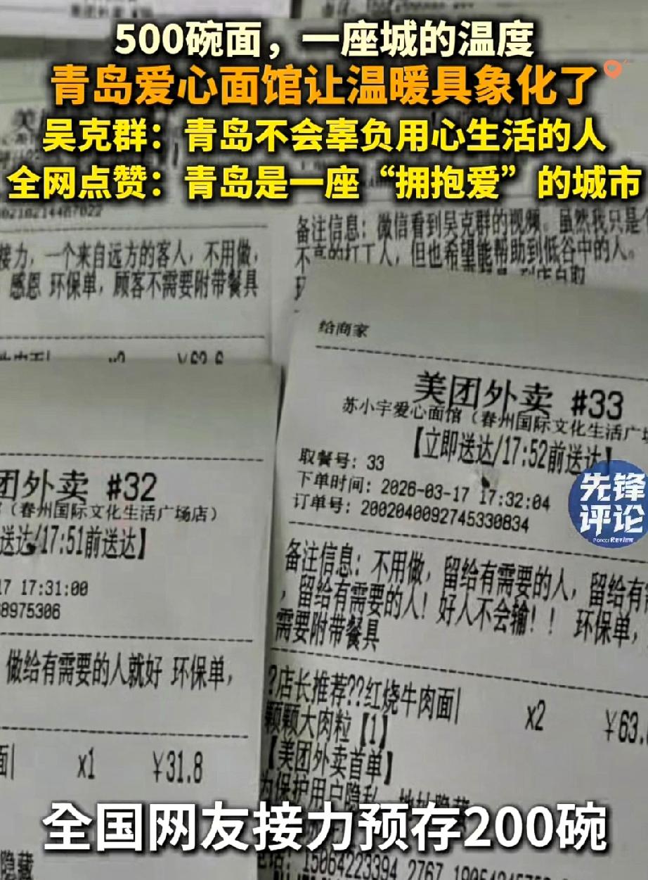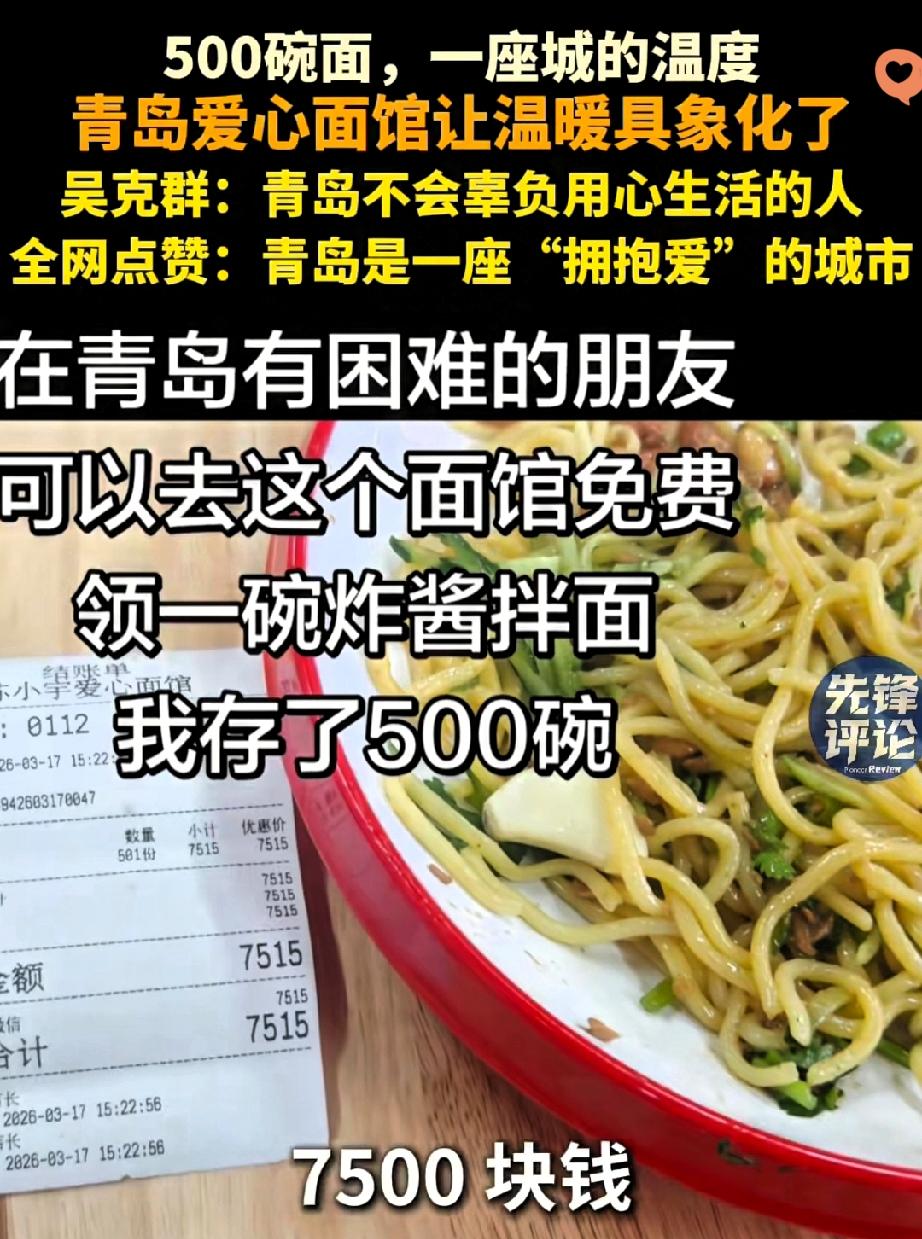 青岛这波爱心接力,真的暖到骨子里了! 残疾店主自己淋过雨,就给困难人免费煮面,结果神秘顾客直接砸7515元预存500碗,全国各地网友跟着“云点单”,把善意堆成了山。 张善领拖着残腿揉面,妻子走后独自带娃,却从没丢过良心。 他的善良从不是刻意作秀,而是低谷里依然想给别人撑伞的本能。 而那些陌生人的回应,更是让善意有了回响——你对世界温柔,世界就会对你温柔以待。 这哪是一碗面啊,分明是人与人之间最纯粹的信任和托举。 现在店主呼吁大家别再云点单,想靠手艺踏实过日子,这份清醒更让人敬佩。 善良从来都是双向奔赴,你愿意为这样的暖心小店专程打卡吗?