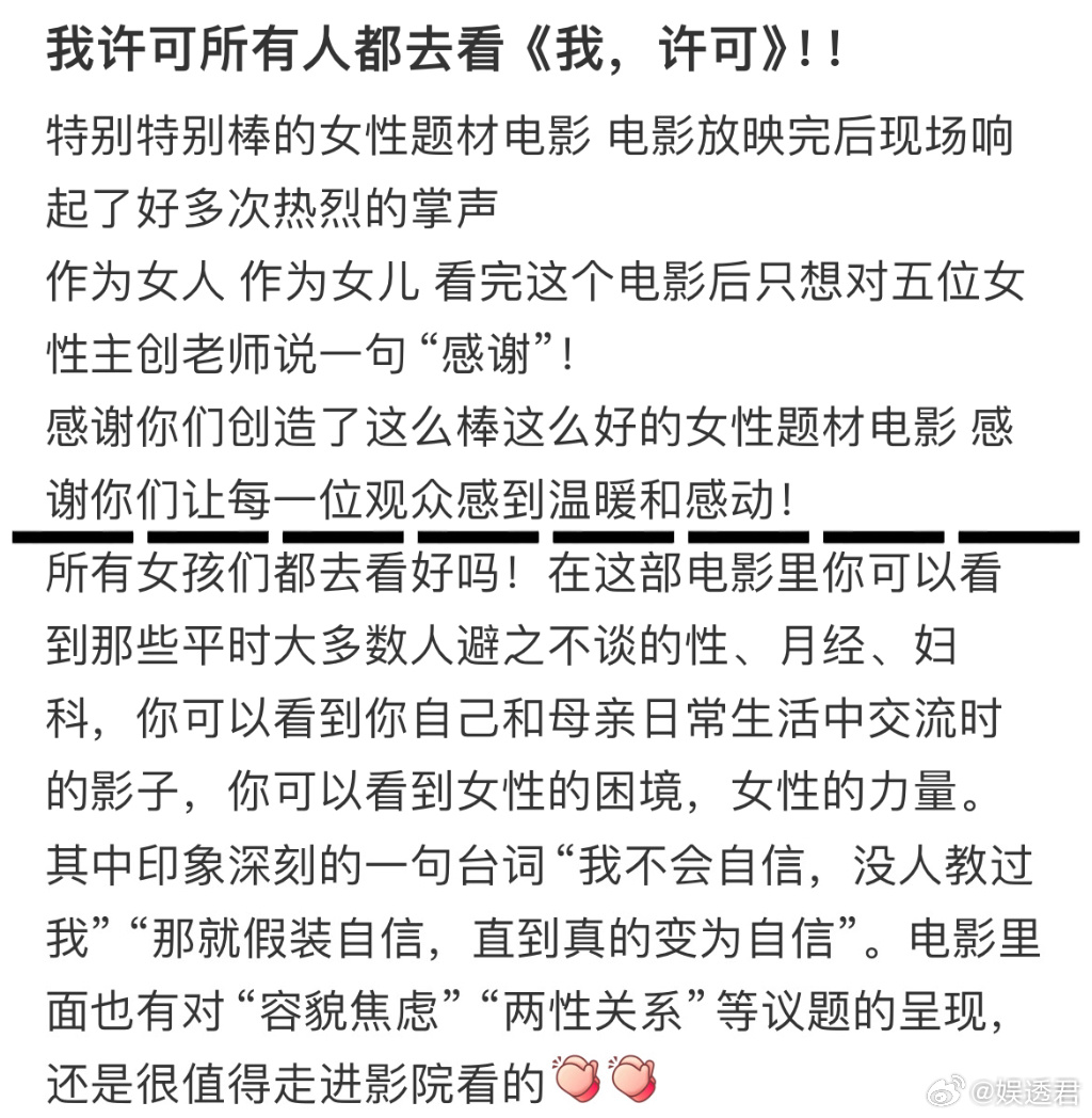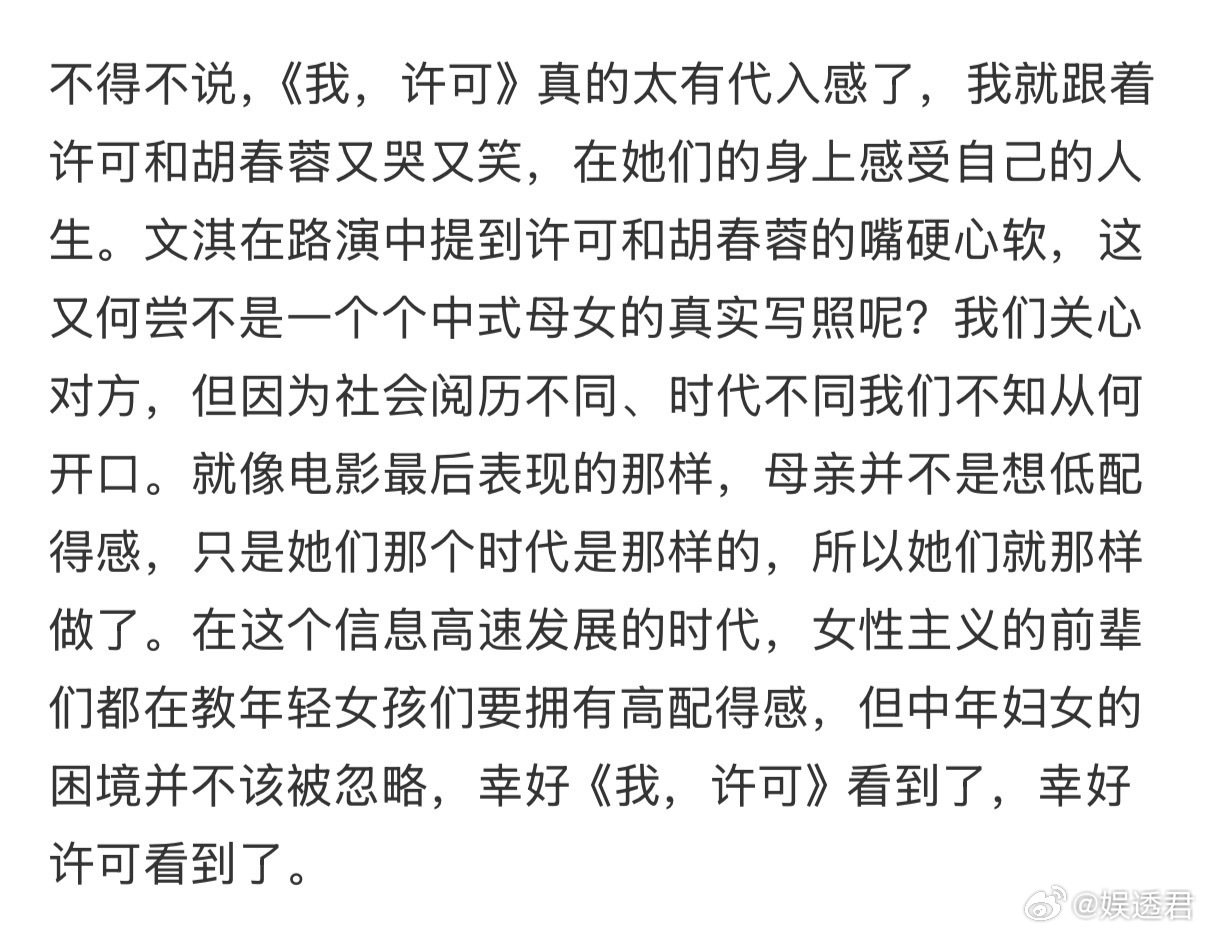 我许可 必须为《我许可》打call!文淇和秦海璐的精彩表现让代际话题和女性自我觉醒变得引人入胜。没有狗血的洒狗血剧情,没有夸张的煽情表演,在真实的日常对话和嬉笑争吵中,展现出女性之间深厚的情感和共同成长的决心,爱了!