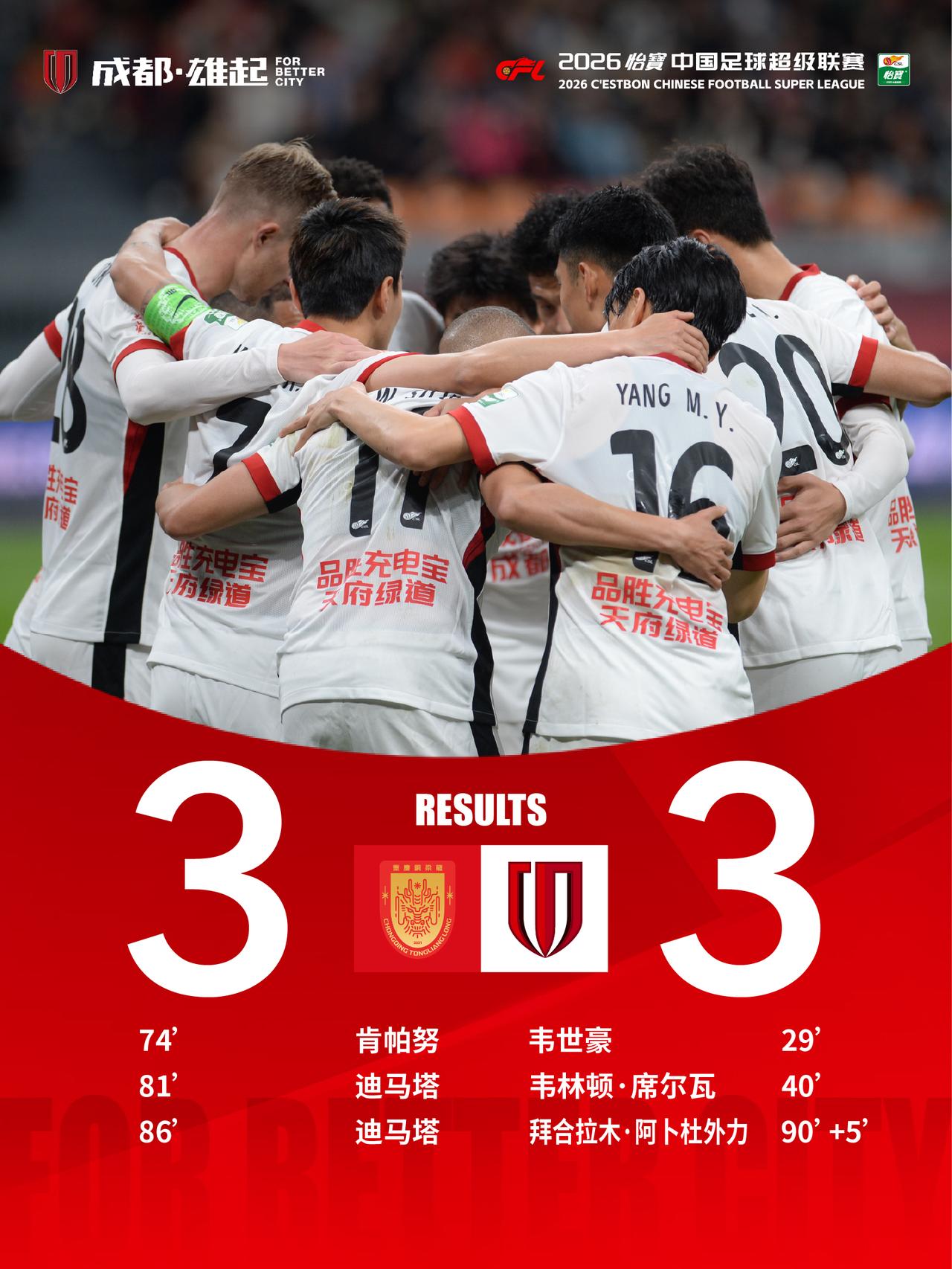 今晚19:35,2026怡宝中超联赛第3轮,成都蓉城客场对阵重庆铜梁龙。费利佩因伤缺阵,王子铭迎来首发。上半场,韦世豪点射破门,收获个人新赛季首粒进球。此后,席尔瓦接韦世豪传球后,在禁区外轰出一记世界波,皮球直挂网窝。易边再战,对手连续打进三球。伤停补时阶段,拜合拉木将比分扳平!最终,成都蓉城3-3重庆铜梁龙。 衷心感谢今晚到现场为成都蓉城将士呐喊的数千名球迷家人们!你们跨越山海、身披红袍,用全场不息的呐喊撑起客场红色看台,成为球队最坚实的后盾。我们将重整旗鼓,用更好的表现回馈每一份支持。