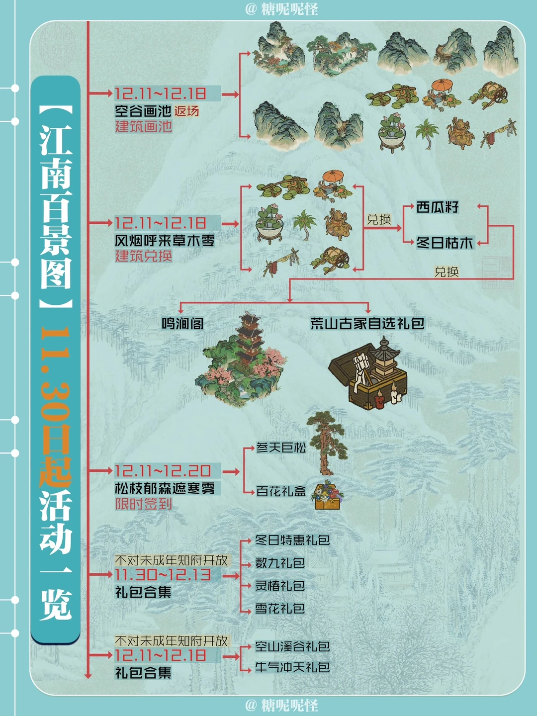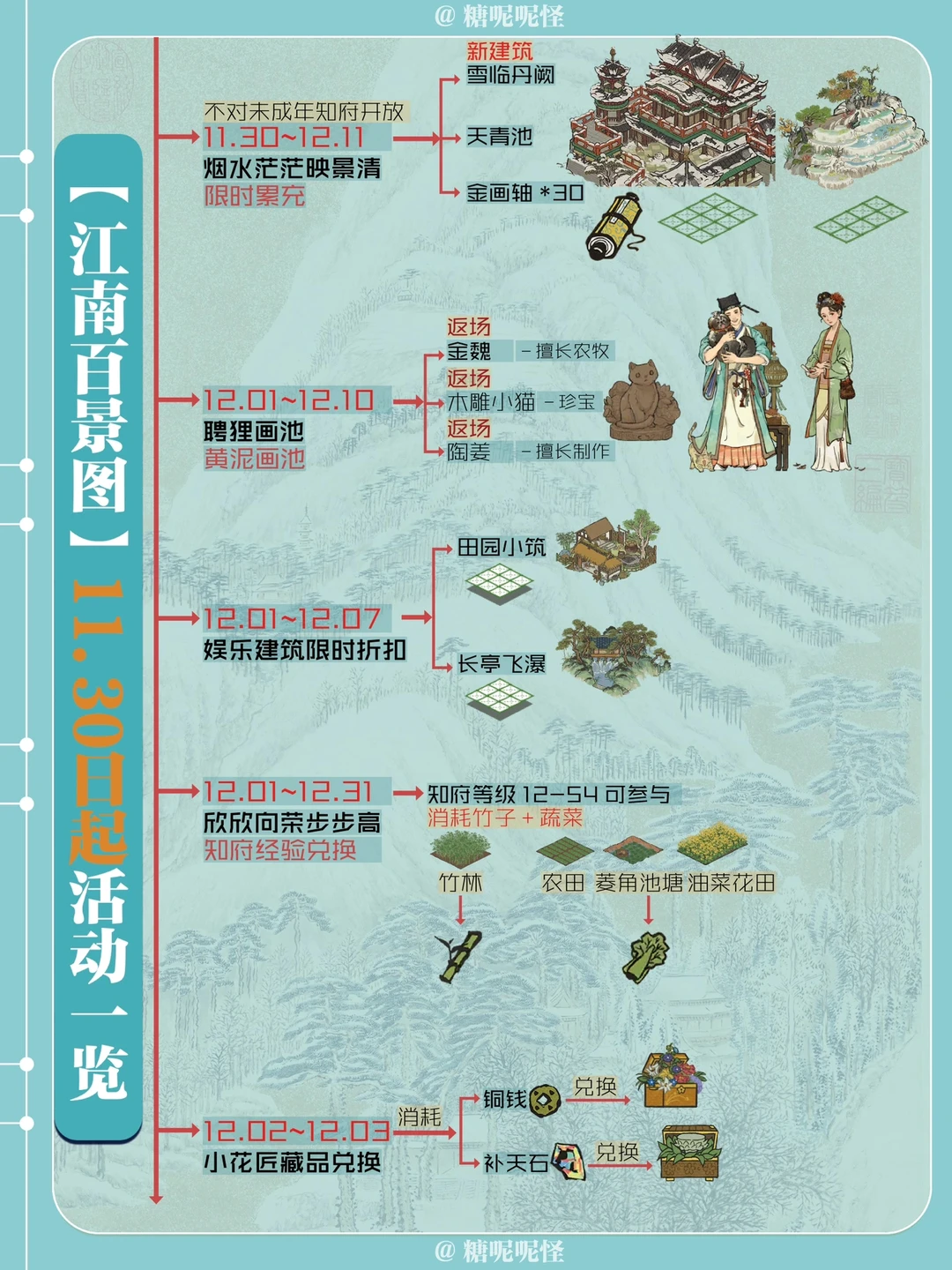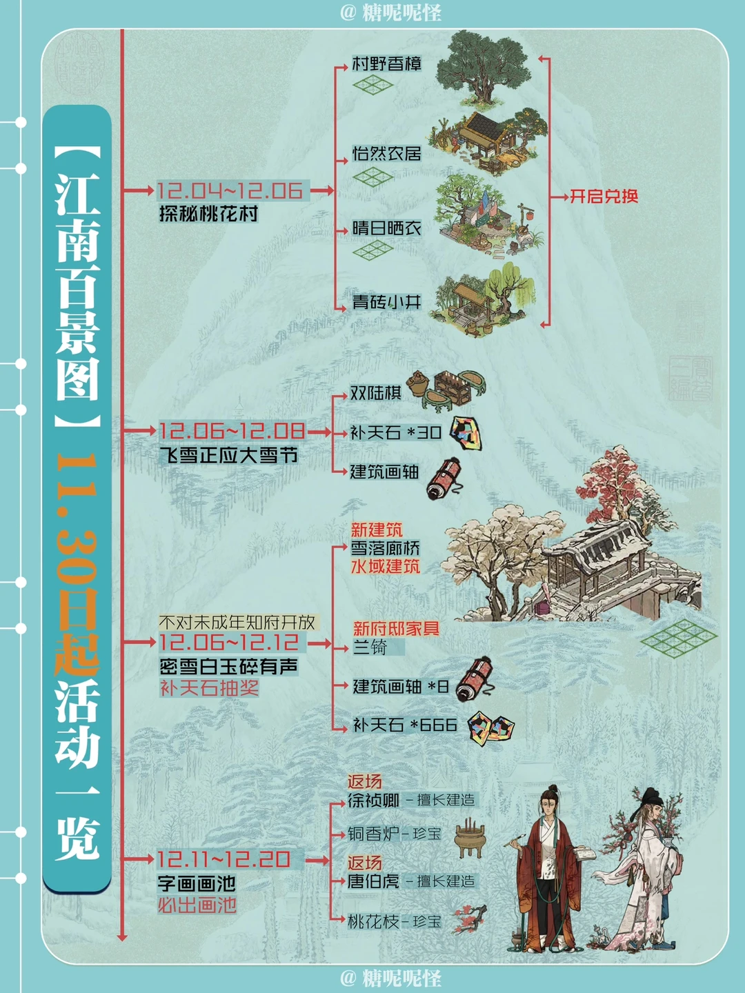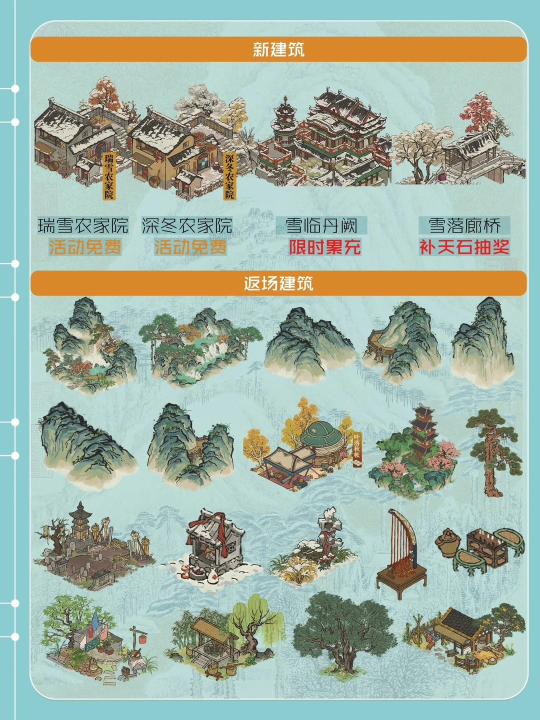 江南百景图11月30日起活动前瞻。 总结: 新建筑: 【瑞雪农家院】【深冬农家院】可以免费获取(一定要搞到手!!!!) 【雪临丹阙】限时累充;【雪落廊桥】补天石抽奖 返场建筑: 空谷画池来了[哇R][哇R][哇R]