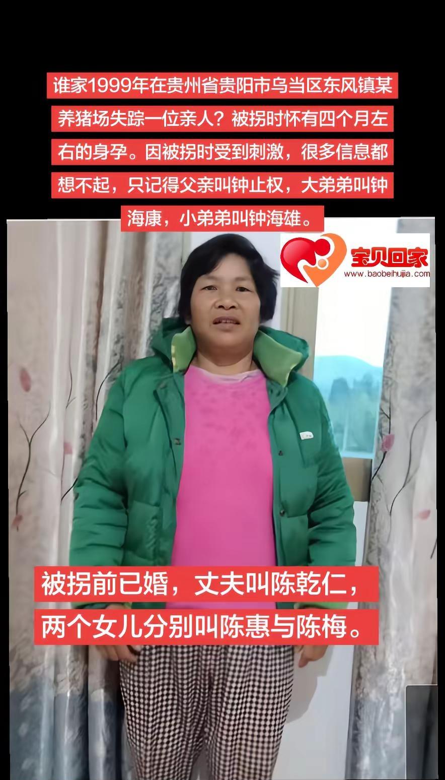 约1969年出生1999年被拐女士寻家。谁家1999年在贵州省贵阳市乌当区东风镇某养猪场失踪一位亲人?被拐时怀有四个月左右的身孕。因被拐时受到刺激,很多信息都想不起,只记得父亲叫钟止权,大弟弟叫钟海康,小弟弟叫钟海雄。宝贝回家之万家团圆 抖音寻人 严厉打击拐卖妇女儿童 贵阳