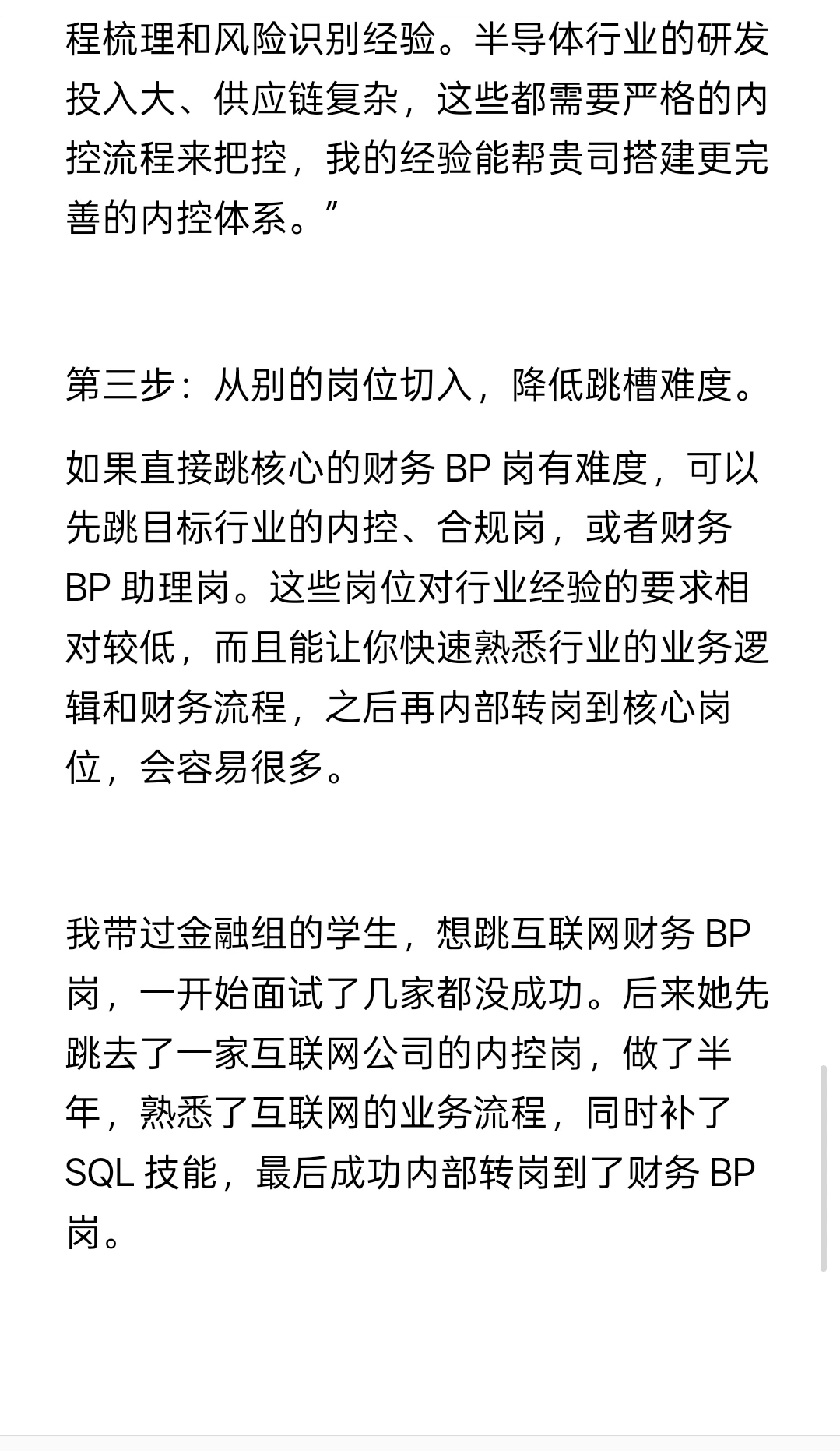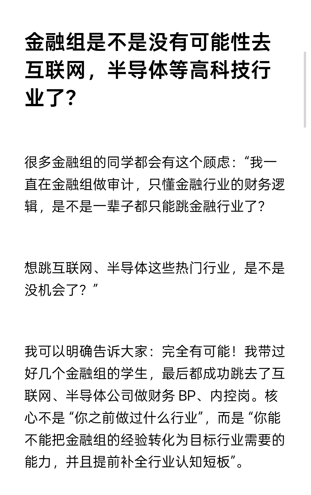 我可以明确告诉大家:完全有可能!我带过好几个金融组的学生,最后都成功跳去了互联网、半导体公司做财务 BP、内控岗。核心不是 “你之前做过什么行业”,而是 “你能不能把金融组的经验转化为目标行业需要的能力,并且提前补全行业认知短板”。
