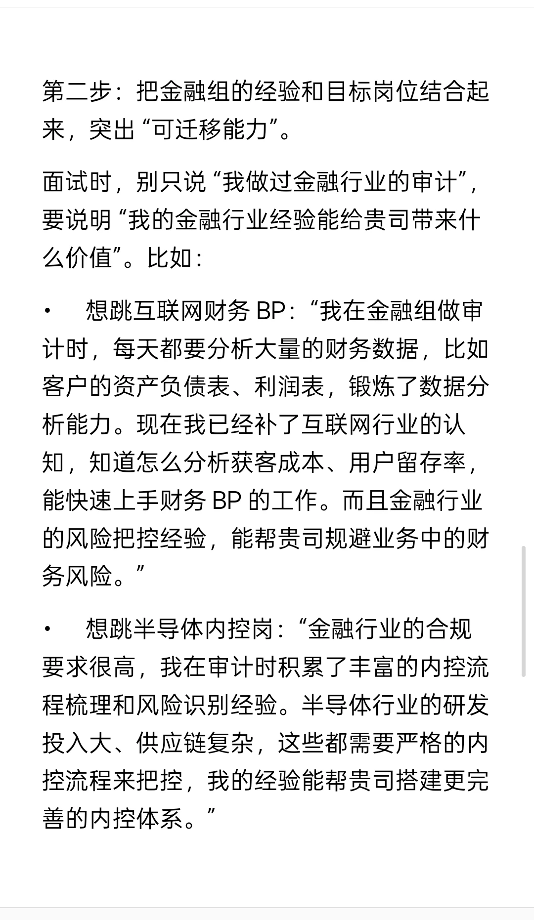 面试时,别只说 “我做过金融行业的审计”,要说明 “我的金融行业经验能给贵司带来什么价值”。