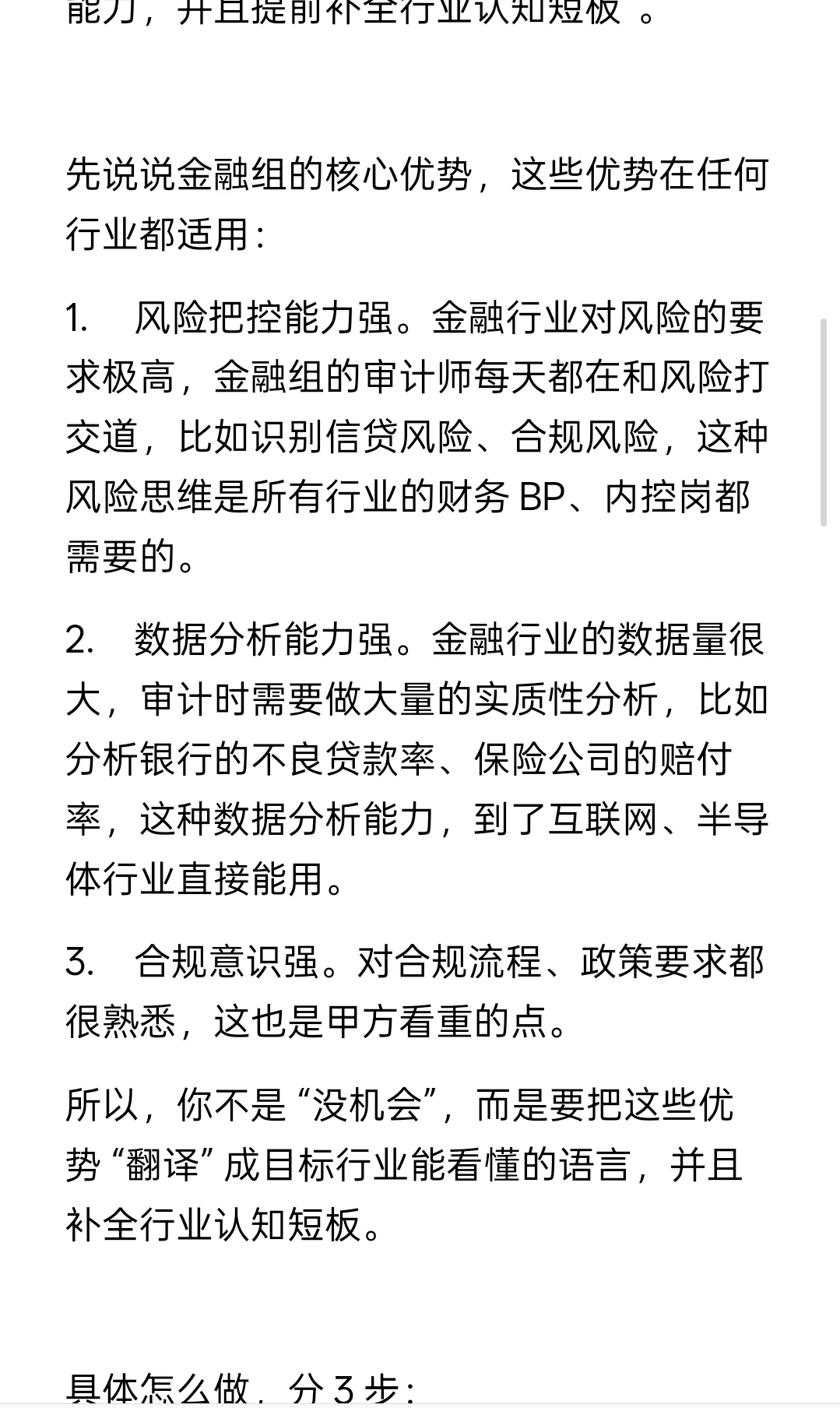 1. 风险把控能力强。金融行业对风险的要求极高,金融组的审计师每天都在和风险打交道,比如识别信贷风险、合规风险,这种风险思维是所有行业的财务 BP、内控岗都需要的。
