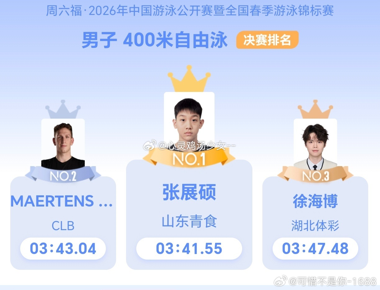 中国游泳公开赛男子400米自由泳决赛,张展硕以3分41秒55刷新个人最好成绩强势夺金,马尔滕斯 3:43.04摘银,徐海博 3:47.48夺铜。