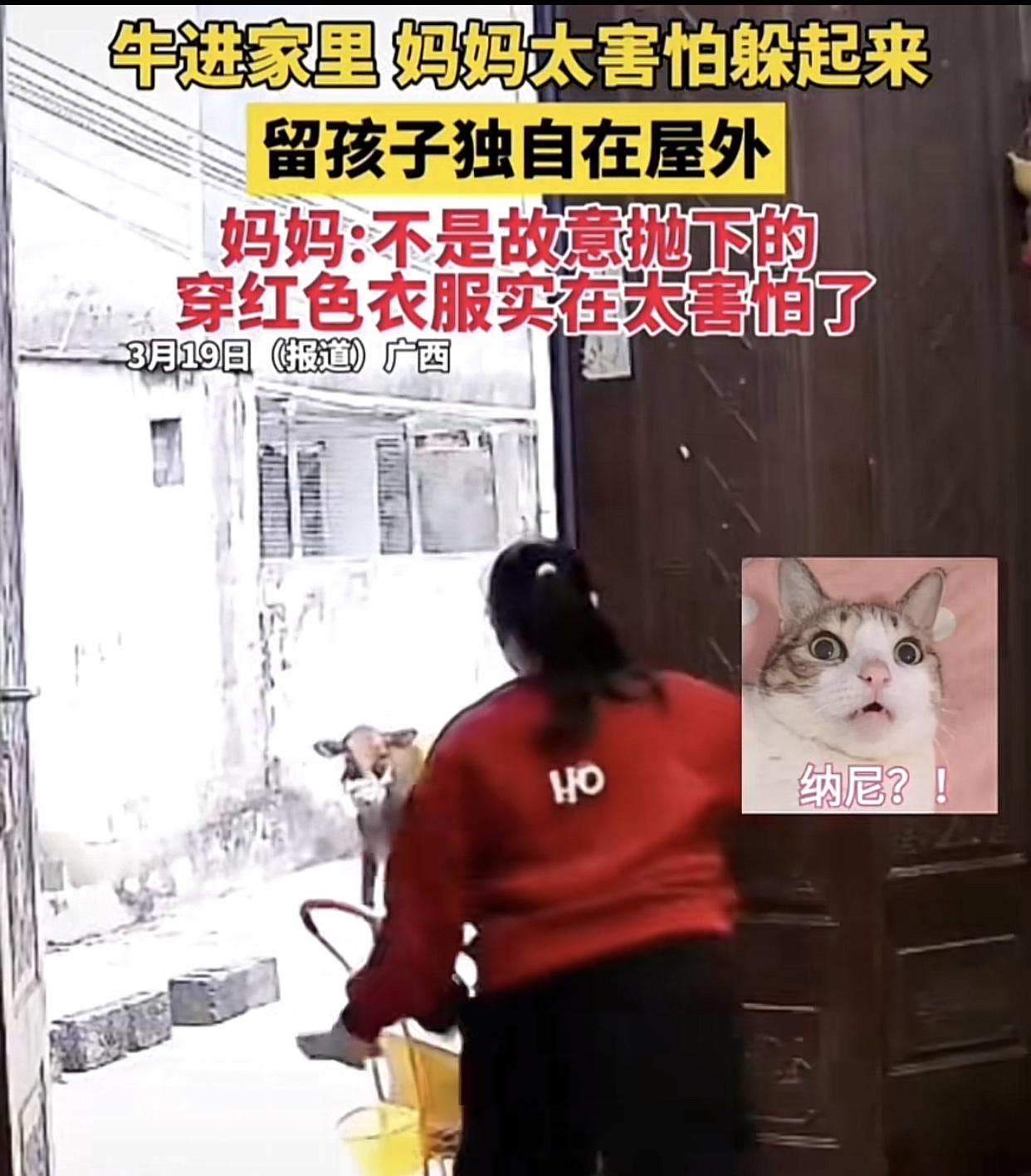 牛突然出现在家门口,母亲穿红衣害怕的直接不管孩子独自进屋。广西一女子坐在家门口带娃时突然走过来一头牛。女子和牛对视了一眼后,先是拿起手机点开拍了一张照, 后来她看见那头牛似乎要往她的这个方向走过来,于是她赶紧起身准备进屋,期间她拉了一下婴儿车,但也仅仅只是拉了一下,然后就松开手,自己跑进家里躲了起来,甚至还关上了门,留下孩子独自在屋外面对着两头牛。 事后女子自己还将视频发到网上并配文:“宝贝,妈不是故意抛下你的,实在是妈穿红色衣服太害怕了”。这个视频是她自己家的监控拍下来的,也是她自己发出来的,目前好像是被许多网友骂了,所以该视频已经被删除了。 看得这个视频我的第一反应是:这真的是亲妈吧?从看到牛再到自己进屋,15秒的时间第一反应居然是拍照,就没想过把孩子抱进去吗?都说女本柔弱,为母则刚,母亲这个词在我心里是很伟大、很神圣的,她可以为了自己的孩子连命都不要。只能说视频里的这位红衣女子的行为真的让人一言难尽呐!