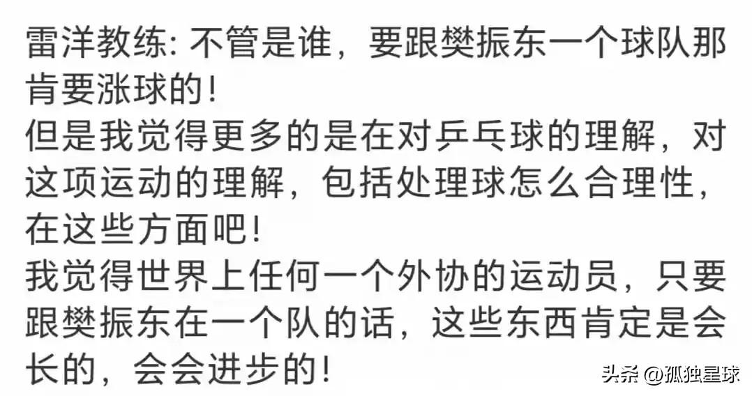 说个不同观点:樊振东打德甲,其实就是在帮德乒! 已经加盟德乒做教练的雷洋,这句话一针见血,他说樊振东加盟哪个俱乐部,哪个俱乐部就涨球,在萨尔布吕肯,弗朗西斯卡涨球了,去杜塞尔多夫,邱党估计也要涨球了。 我有个坚持很久的观点,如果中国乒超联赛不搞起来,不成为第一联赛,国乒水平会持续下降。 很难想象,国乒水平最高,但联赛水平却不是最高的,所以优秀球员反而还要去欧洲打联赛,这绝对不是健康模式。 樊振东去了德甲,其实无形中提升了德甲水平,还有影响力。 乒协应该把联赛搞好,让外协最优秀的球员都来中超打球,才是可能维持国乒水平。