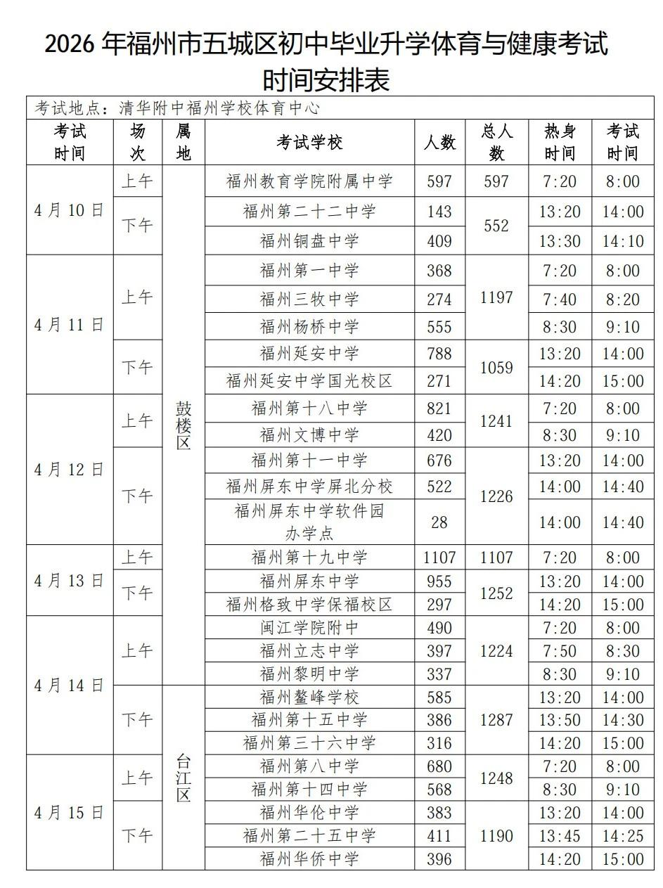 果然是这样!体育中考生要准备起来了!福州市教育局正式发布:2026年福州体育中考各校考试时间将于4月10日-25日进行!考试地点:清华附中福州学校体育中心!你的学校和住处离这儿远吗?真的改了!2026年福州体育中考各校时间安排出炉!要看清楚了,你的学校在下表的哪个时间段?考前准备建议家长带上孩子过去仓山区清华附中提前熟悉场地,有条件可到考点踩点;近期适量运动,适可而止,防止受伤!准备好运动服、运动鞋、水杯等装备。中考体考攻略 福州初三生 福州体育特长生 福州初三体考 台江中考 福州市二中 福州一中运动会 福州体育单招 实时更新福州教育讯息,收藏并关注