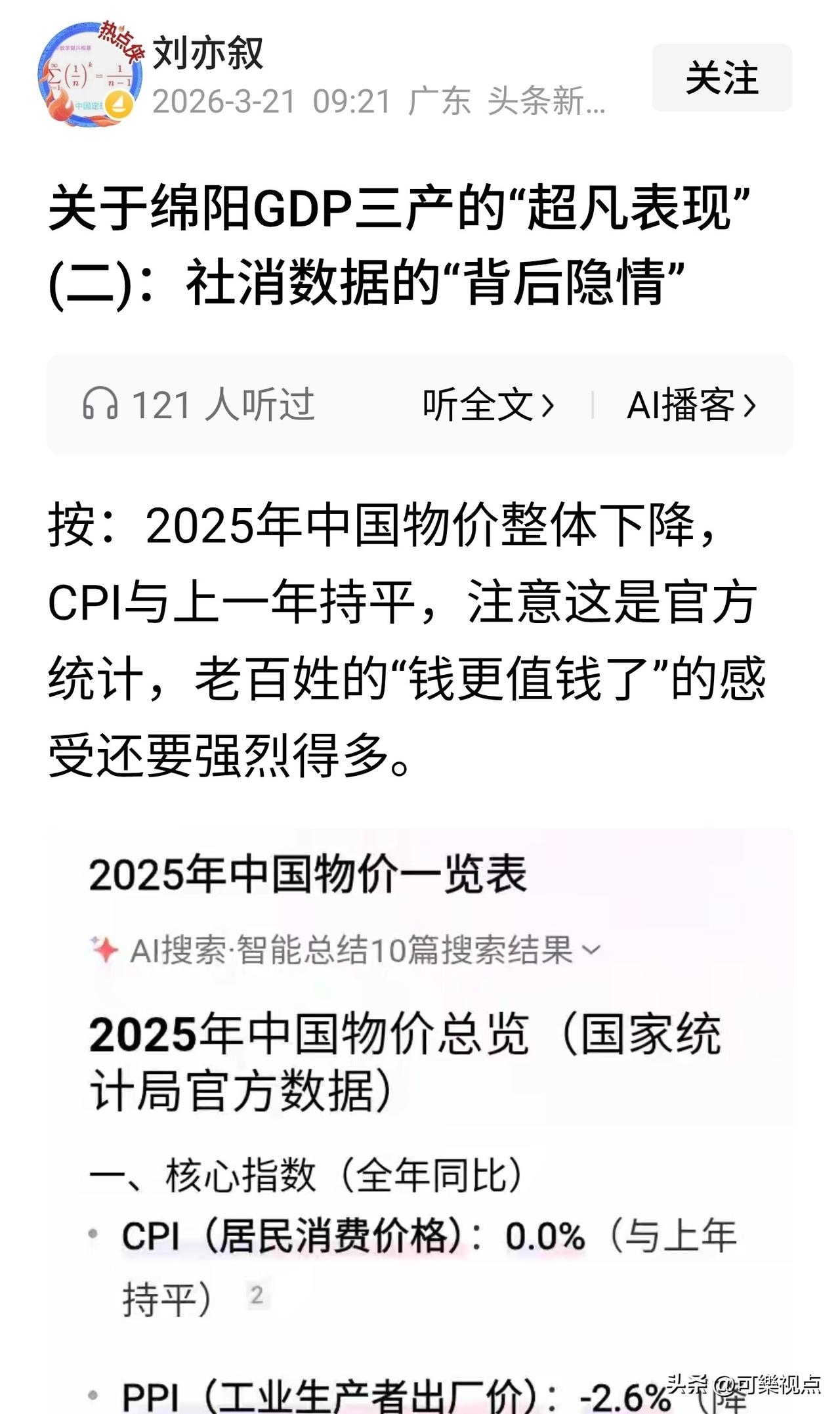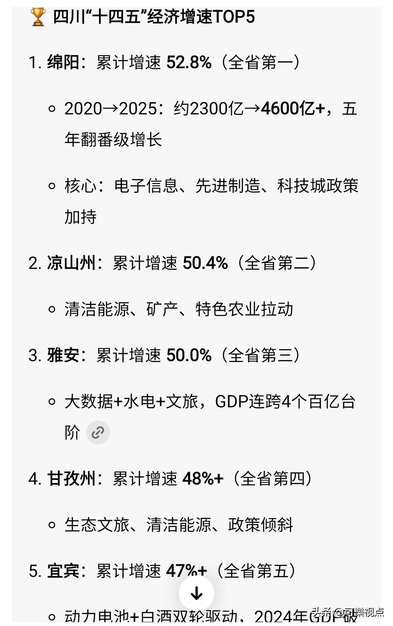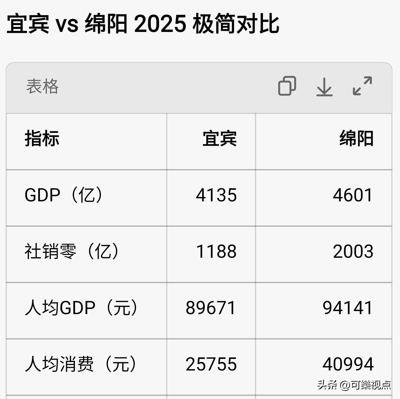 绵阳社消零的非凡表现从何而来,绵阳宜宾到底差在哪? 📊 核心数据(2025年,官方口径) 绵阳:社消零2003.4亿元,增速7.1% ;常住人口约492万,城镇化率约60%。 宜宾:社消零1187.63亿元,增速-1.5% ;常住人口461.1万,城镇化率55.15%。 ✅ 关键成因拆解 1. 人口与城镇化:基数差+城镇密度高 绵阳常住人口比宜宾多约31万,且城镇化率高近5个百分点,城镇人口多约100万。城镇是社消零的核心载体,100万城镇人口的差距直接拉开消费体量。宜宾虽为人口净流入,但城镇化起步晚、基数低。 2. 区位红利:距成都1小时,承接外溢 绵阳紧邻成都,西成客专、绵遂高速等交通枢纽完善,承接成都科教、商务、高端消费外溢,本地高端零售、医疗康养、文旅体验更活跃 。宜宾虽为川南门户,与重庆、成都的要素竞争更直接,外溢承接力弱于绵阳。 3. 收入与消费能力:科技城带来高购买力 绵阳作为科技城,集聚中物院、长虹、九洲、京东方、惠科等主体,高技能人才与高薪岗位更多,居民可支配收入与消费意愿更强 。宜宾以白酒、动力电池等工业为主,收入结构偏中低端,消费拉动力度有限。 4. 消费结构与业态:高端+线上更有优势 绵阳社零中商品零售1684.3亿元(增7.4%),且限额以上互联网零售90.7亿元(增62.0%),高端商超、品牌首店、科技体验消费更密集 。宜宾社零同比下降1.5%,传统商贸占比高,高端供给不足,线上零售虽增速快(24.69亿元,增99.4%),但体量远小于绵阳 。 ☆ 绵阳靠人口+城镇化的硬基数,叠加成都近邻的外溢红利和科技城带来的高收入软实力,把消费体量和质量双双拉到宜宾前面;宜宾则处于工业主导的结构转型期,消费尚处培育阶段,这是社消零差距的核心。