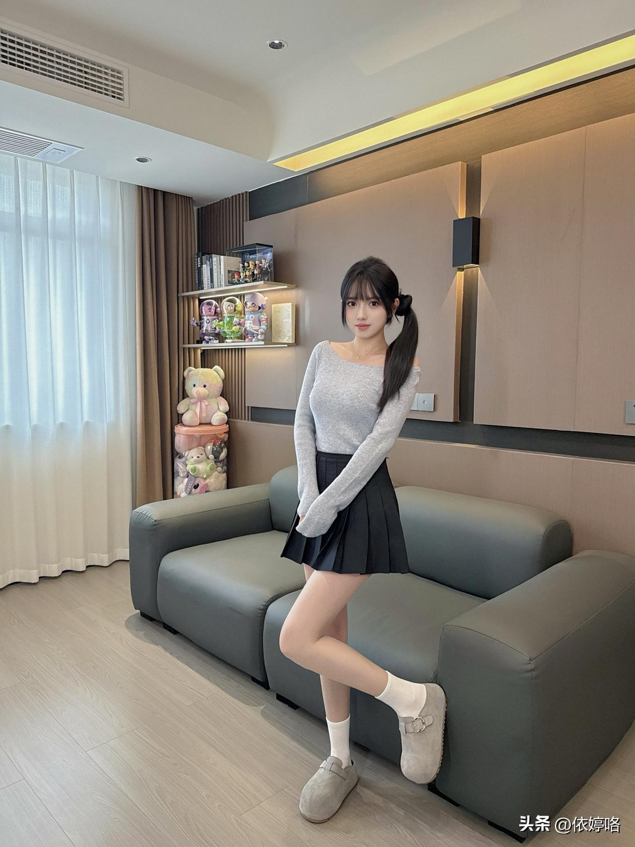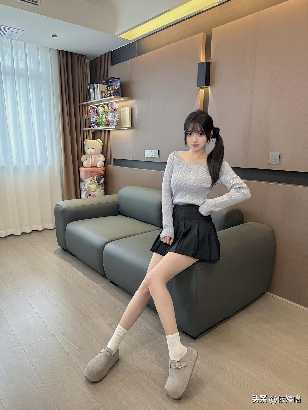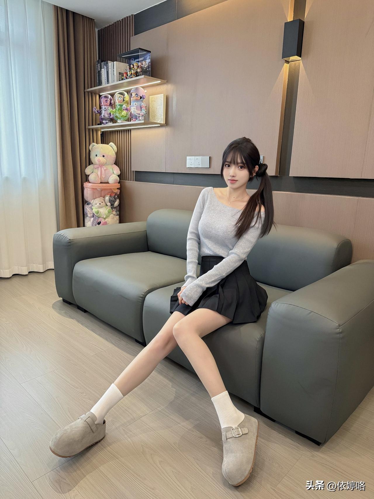 浅灰露肩针织衫软乎乎的,单边露肩设计刚好露出锁骨,把肩颈线条衬得巨好看,修身版型还能显身材✨ 搭配黑色百褶裙,蓬蓬的超显腿长,配上奶白堆堆袜+浅灰小单鞋,小腿细得像开了滤镜,整套温柔又减龄,在客厅拍都像从校园剧里走出来的~ 被闺蜜夸“一整个纯欲学姐住”,日常出街或和姐妹约会穿这套,回头率直接爆