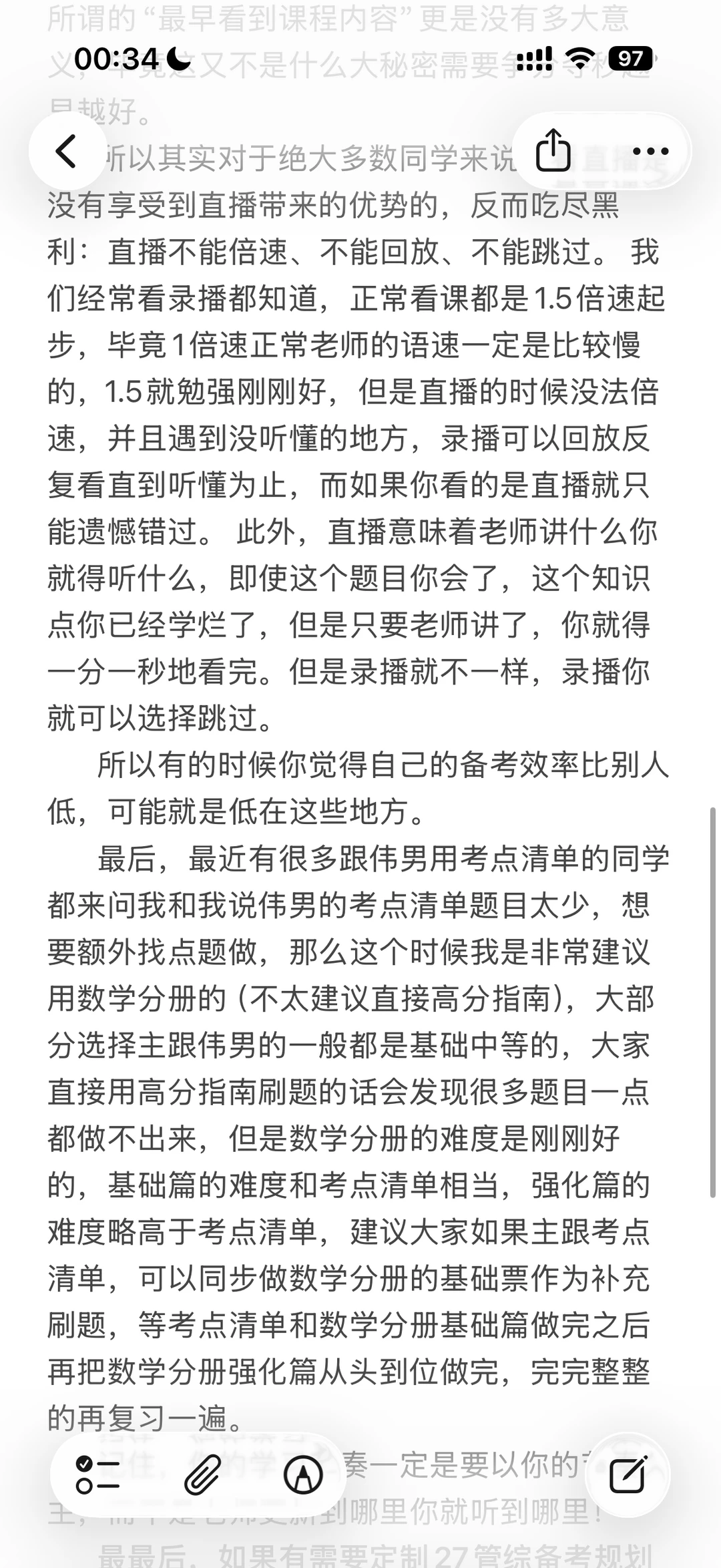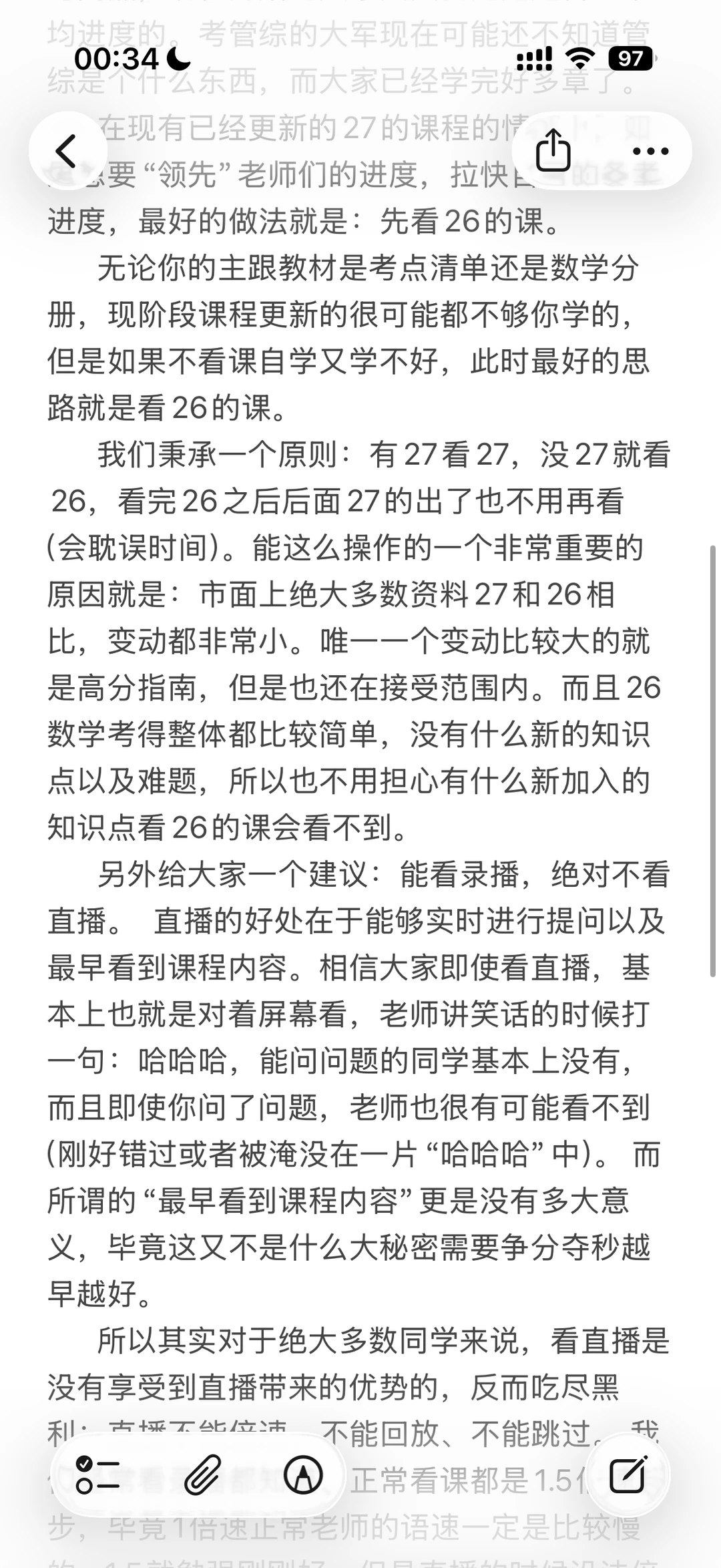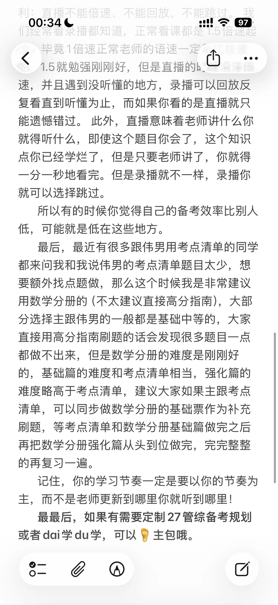 内容速览: 1. 现阶段开始备考已远超平均进度,不用被慢更节奏内耗 2. 核心策略:有 27 看 27,没 27 直接看 26 课程,知识点几乎无变动,不影响备考 3. 效率拉满:坚决看录播不看直播,可倍速、回放、跳过,节省大量时间 4. 刷题补充:跟张伟男考点清单觉得题少,优先配数学分册,难度适配,不建议直接冲高分指南 最最后,如果有需要定制27管综备考规划或者dai学du学,可以🦶主包哦。