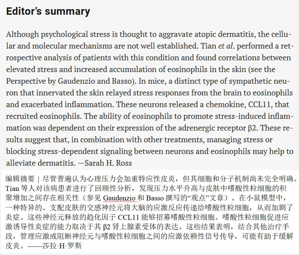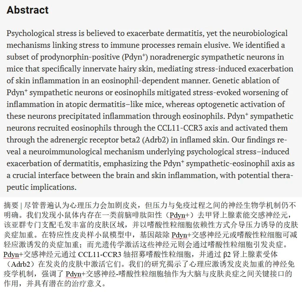 这条“交感神经-嗜酸性粒细胞轴”的发现,把“压力伤皮肤”这句模糊的老话,变成了一条可以被看见、被切断的生物学链条。将来或许不需要苦口婆心地劝患者“别紧张”,而是直接靶向这群Pdyn神经元,或者阻断CCL11和嗜酸性粒细胞之间的通讯,从物理上切断压力对皮肤的伤害。