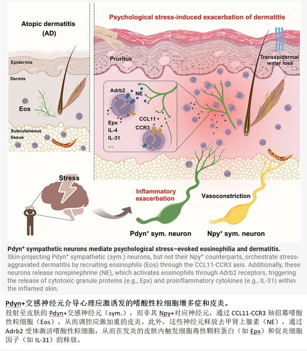 团队追踪到了一类特殊的交感神经元,它们贴着“Pdyn”的标签,专门把神经纤维投射到皮肤上。当小鼠被施加心理压力时,这群神经元立刻被激活。它们做了两件事:一是释放一种叫CCL11的趋化因子,像放出了“集结号”,把嗜酸性粒细胞从血液里往皮肤炎症部位引;二是分泌去甲肾上腺素,给已经抵达现场的嗜酸性粒细胞“上发条”,让它们火力全开地释放破坏性的颗粒蛋白。