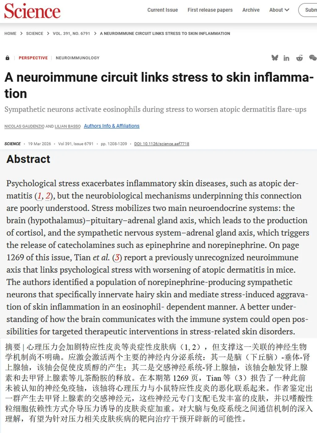 医学界早就知道心理压力会加重皮炎,但大脑里的烦心事,究竟怎么跑到皮肤上去的?复旦大学柳申滨团队发表在《科学》上的研究,第一次把这条隐藏的“脑-皮通路”完整挖了出来。