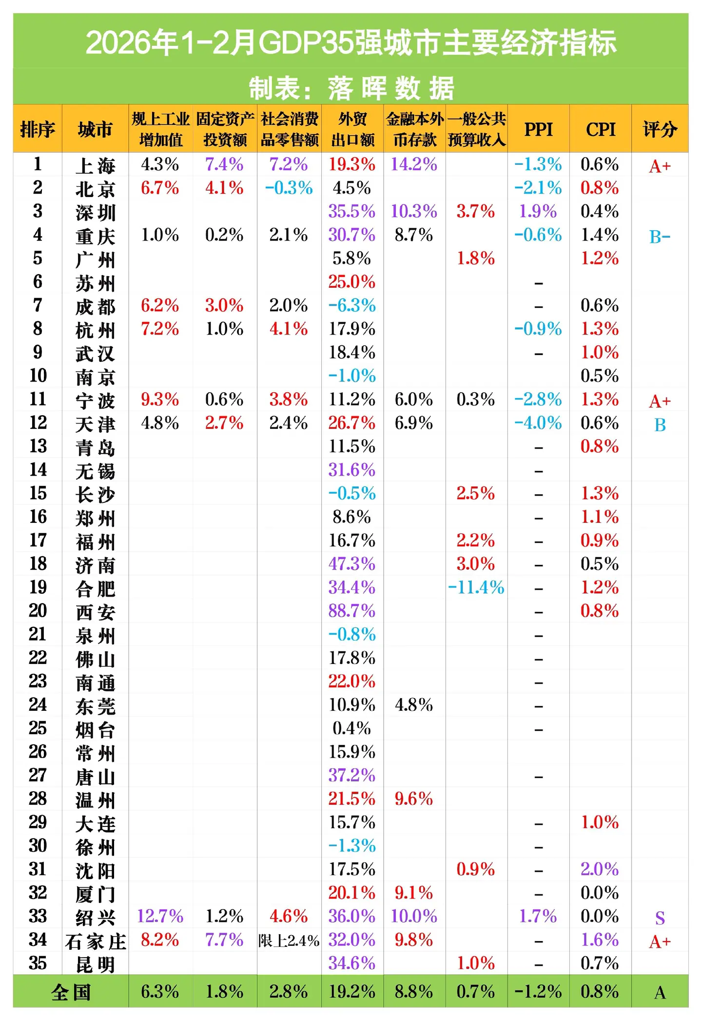2026年1-2月GDP35强城市主要经济指标(4):深圳工业两位数增...
