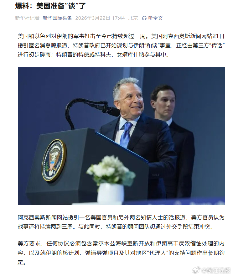 #伊朗武装部队称已从防御转为进攻# 【爆料:美国准备“谈”了 】 美国和以色列对伊朗的军事打击至今已持续超过三周。美国阿克西奥斯新闻网站21日援引匿名消息源报道,特朗普政府已开始谋划与伊朗“和谈”事宜,正经由第三方“传话”进行初步磋商;特朗普的特使威特科夫、女婿库什纳参与其中。