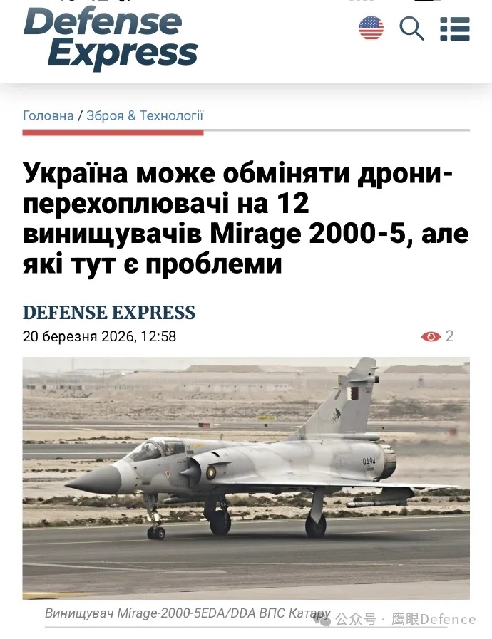 包括法国媒体《情报在线》在内,多个消息源显示,乌克兰已经提出请求,希望用拦截无人机换取卡塔尔拥有的12架幻影2000战斗机,卡塔尔在1997年到1998年期间购买了9架单座型和3架双座型,并在获得了更好的“阵风”后将其全部退役,此前,卡塔尔曾多次试图出售这些基本没怎么使用的幻影2000战斗机,但一直没有成功。
