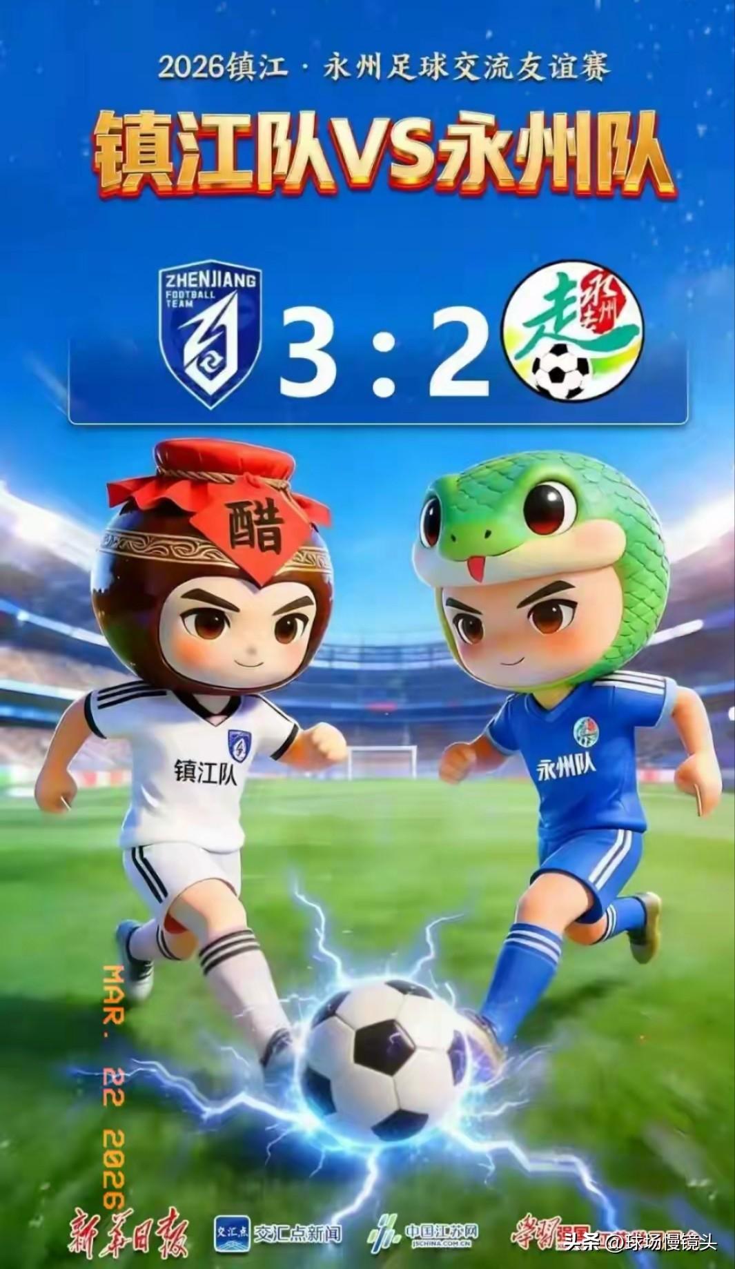 友谊赛镇江3:2永州,湘超冠军输给苏超副班长,剧本都不敢这么写。开场4分钟闪电破门,7分钟内又闪电扳平、最后又被绝杀,防守全是“人情世故”! 镇江文旅镇江队一个进球,永州球迷镇江旅游景点免费一周,3个进球,3周!这哪是友谊赛,这就是镇江文旅营销大会! 开赛4分钟,镇江先声夺人,22分钟就2:0领先,永州作为湘超冠军也不是吃素的,5分钟内,26,29分钟连入2球,扳平比分!然后大家踢的全是人情世故! 直到第70分钟,咱们镇江队的31号王宗哲站了出来。他在禁区内接到队友一记漂亮的倒三角传中,左脚迎球抽射,3比2! 这脚绝杀,直接把现场的气氛点燃了。 3:2的比分刚刚好,东道主赢了面子,客队赚了流量,球迷看了热闹,完美闭环! 镇江队不仅赢了比赛,更是赢的是这座城市用真心换真情的待客之道。马上四月份苏超新赛季就要开打了,有了这场硬仗的磨练,镇江队定会不负众望,晋级淘汰赛! 苏超 镇江队 永州队