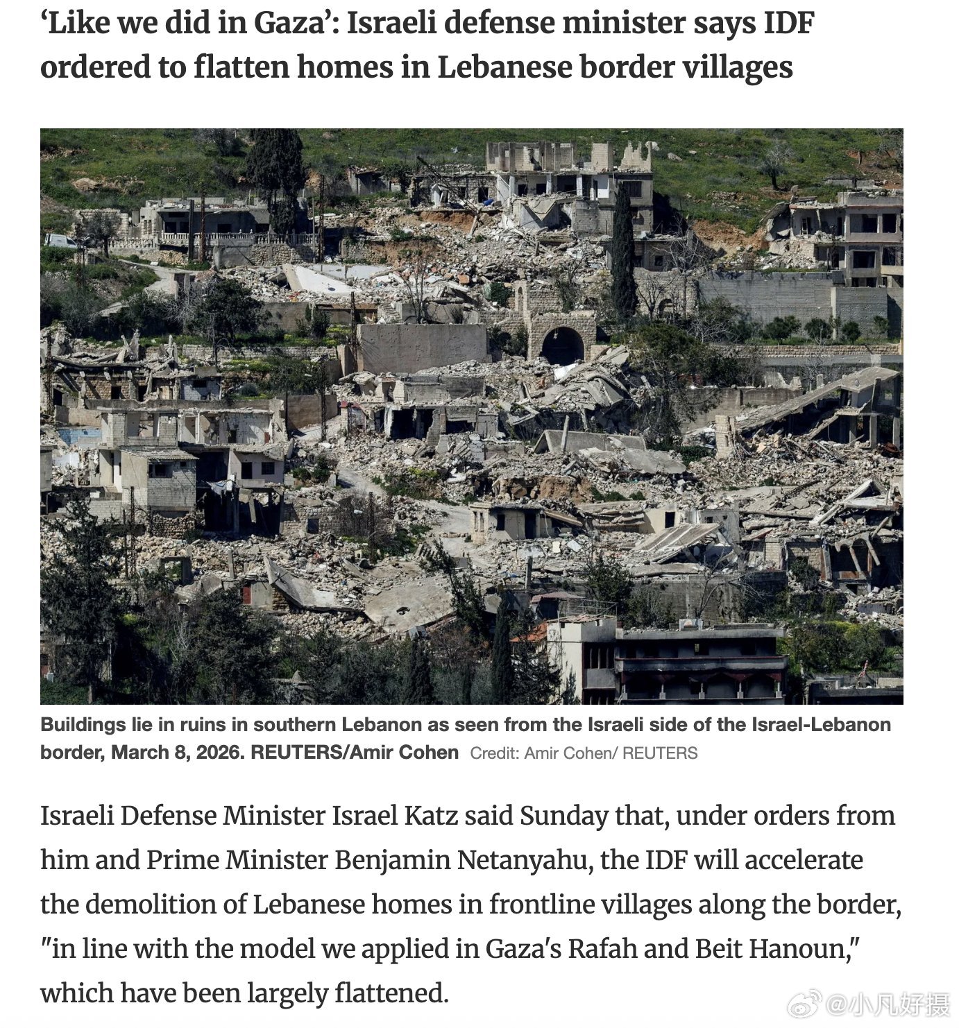 畜生!据以色列《国土报》,“就像我们在加沙所做的那样”:以色列国防部长叫嚣,他和战犯内塔尼亚胡已经给IDF下达命令,夷平黎巴嫩边境村庄的房屋。美伊以冲突伊朗发起第74波打击伊朗宣布战斗进入新阶段黄媒不会说的真相