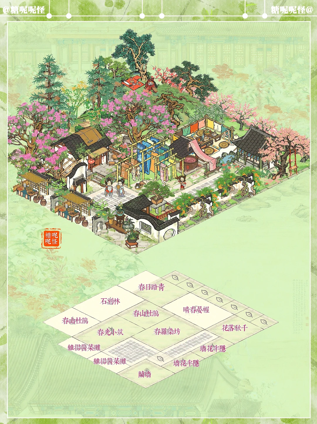 建筑:春罗染坊|晴春宴幄|晴日晒衣|春山杜鹃|春光小筑|花落秋千|春日踏青|石刻林|维扬酱菜摊|墙花半隐